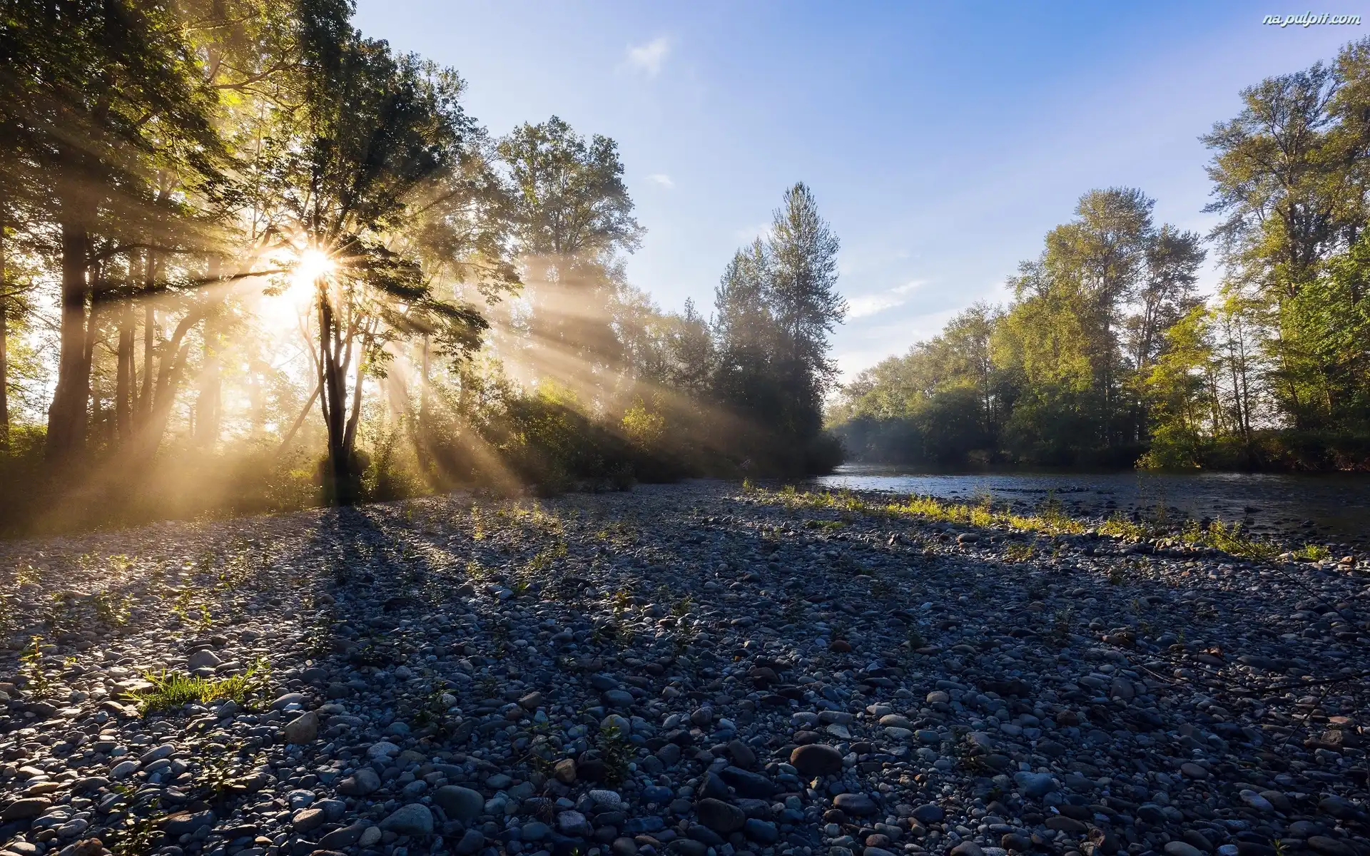 Kamienisty, Promienie słońca, Drzewa, Brzeg, Rzeka, Świt Na Pulpit