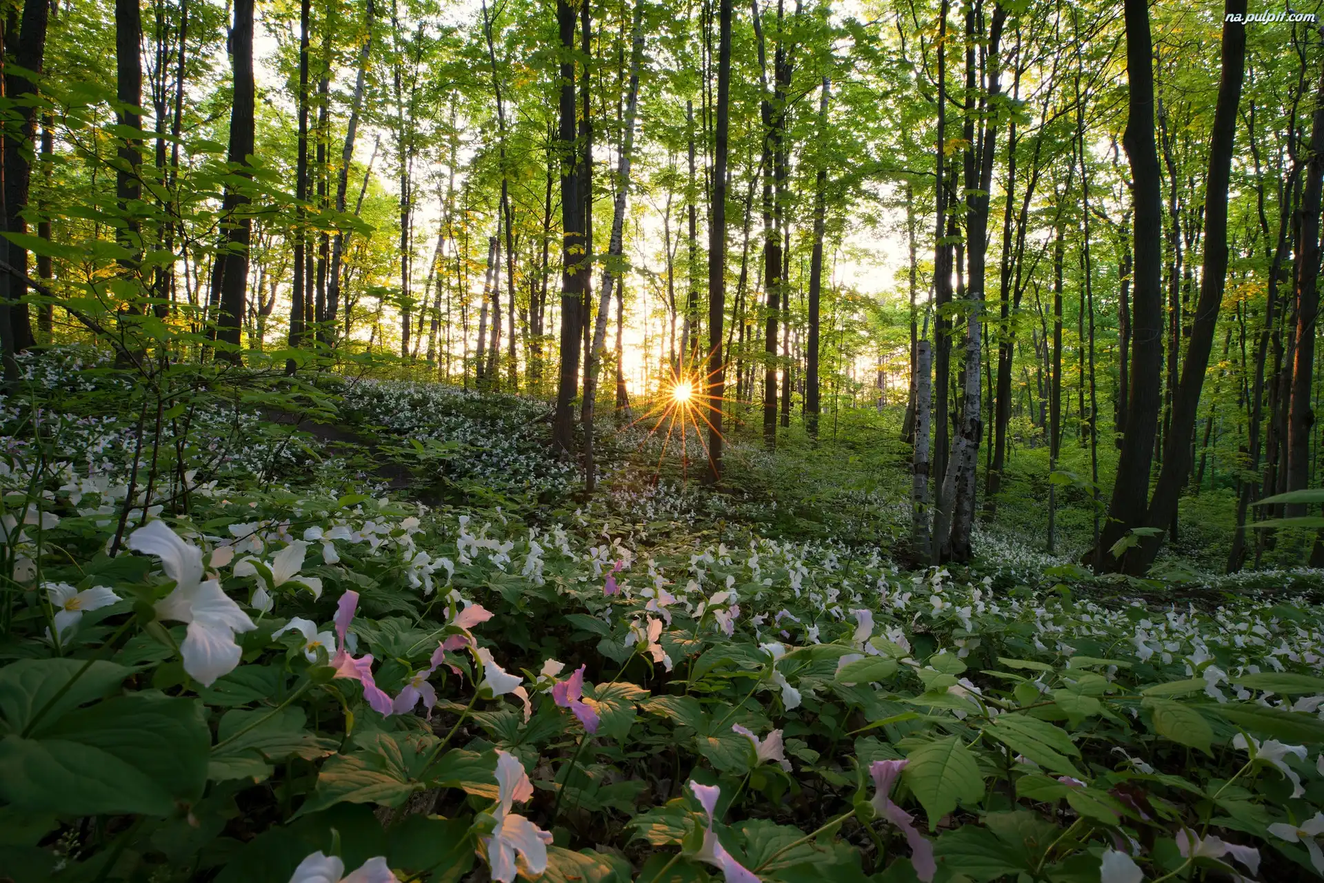 Zieleń, Las, Drzewa, Promienie słońca, Kwiaty Na Pulpit