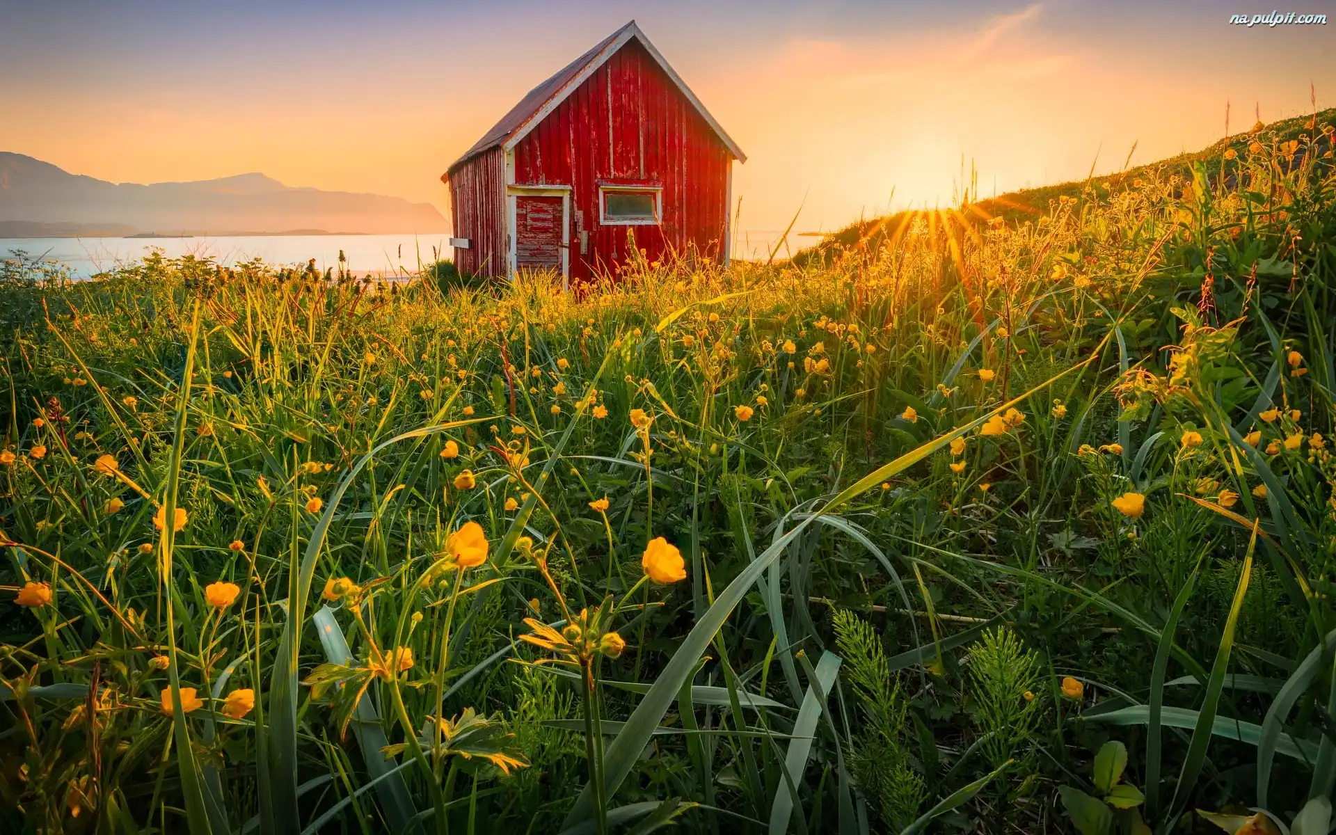 Dom, Wzgórze, Kwiaty, Promienie słońca, Łąka, Czerwony Na Pulpit