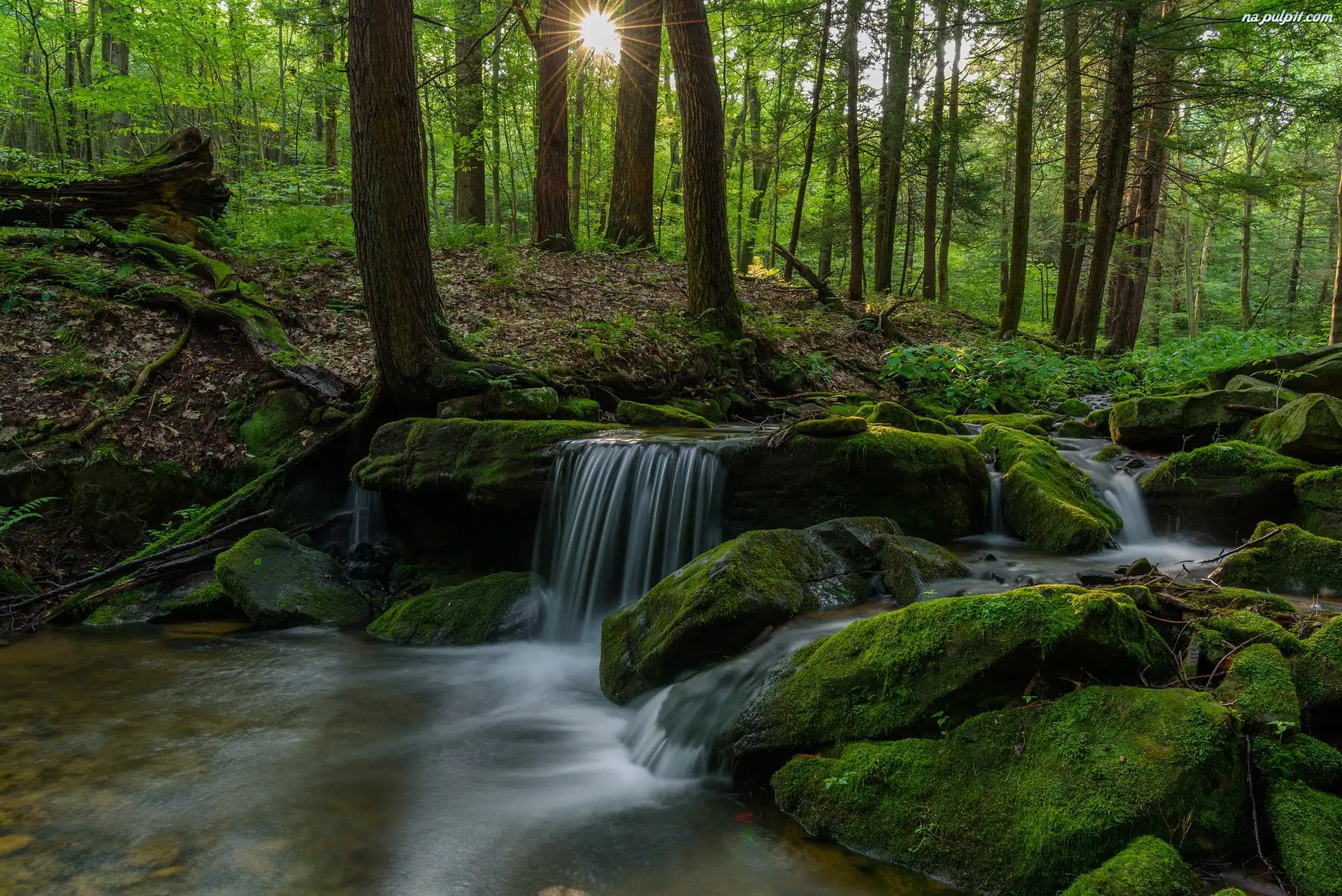 Promienie słońca, Kamienie, Omszałe, Las, Rzeka Na Pulpit