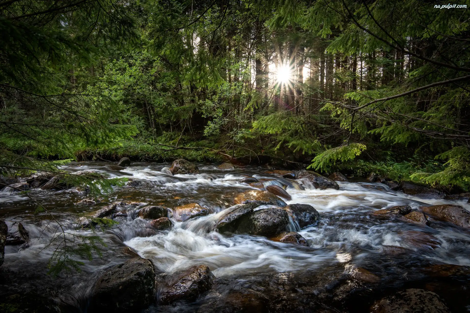 Promienie słońca, Rzeka, Las, Kamienie Na Pulpit