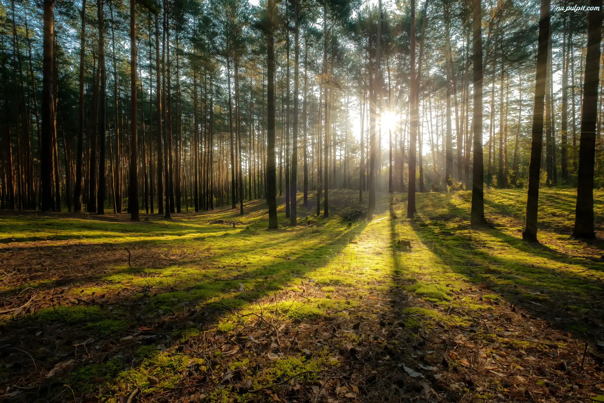 Promienie słońca, Drzewa, Las, Przebijające światło Na Pulpit