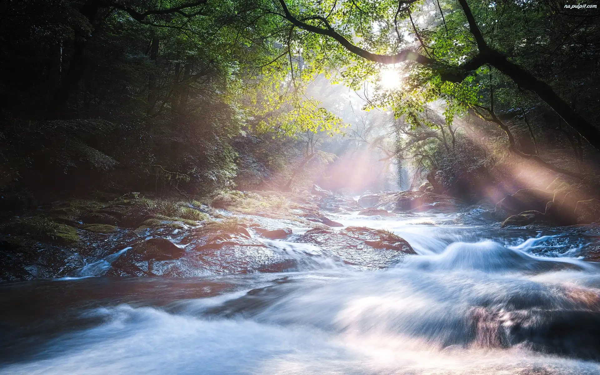 Promienie słońca, Kamienie, Rzeka, Drzewa Na Pulpit