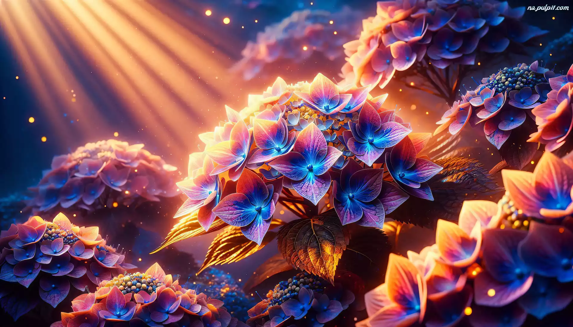 Kwiaty, Promienie słońca, Grafika, Hortensje Na Pulpit