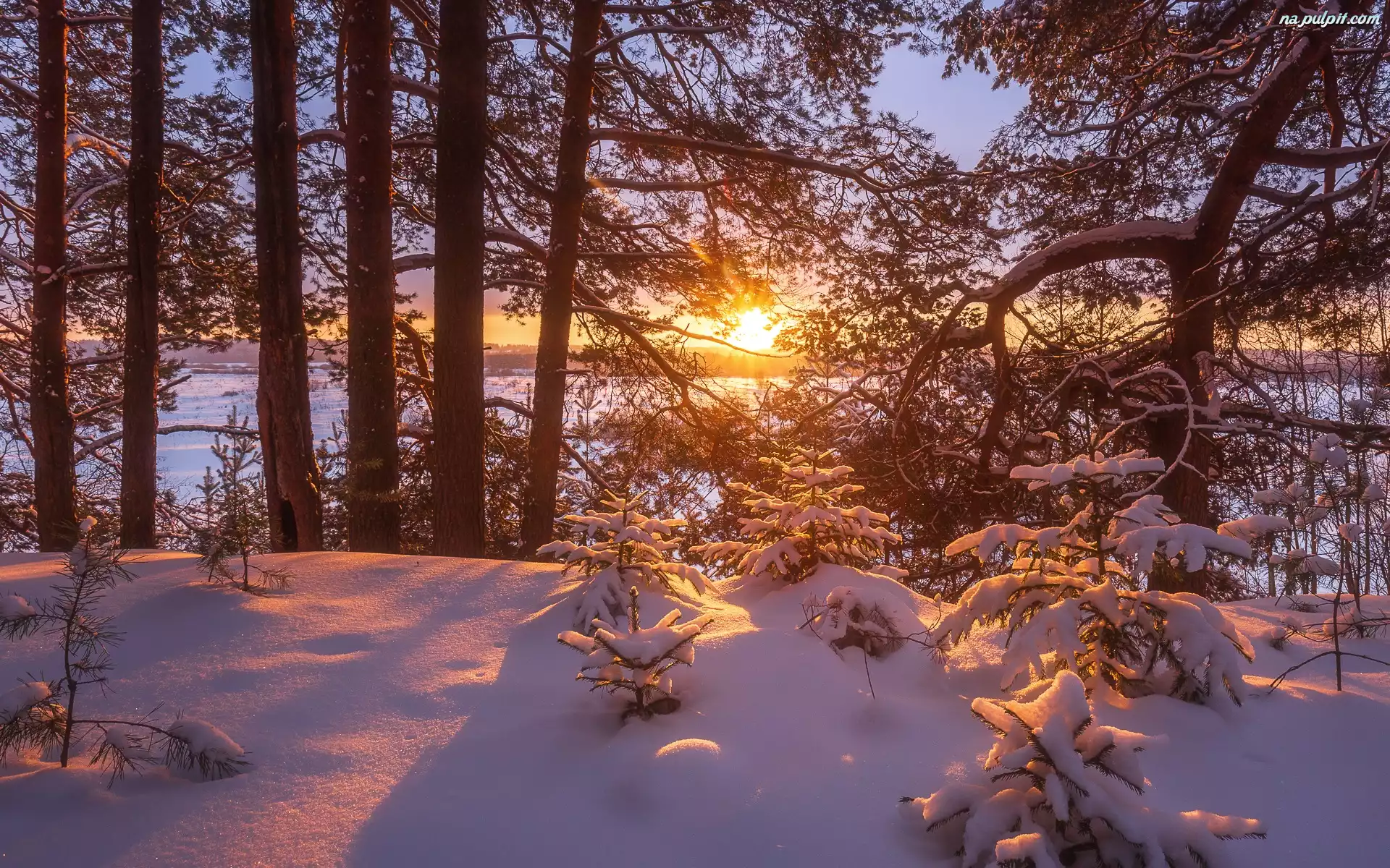 Zaspy, Zima, Drzewa, Promienie słońca, Śnieg