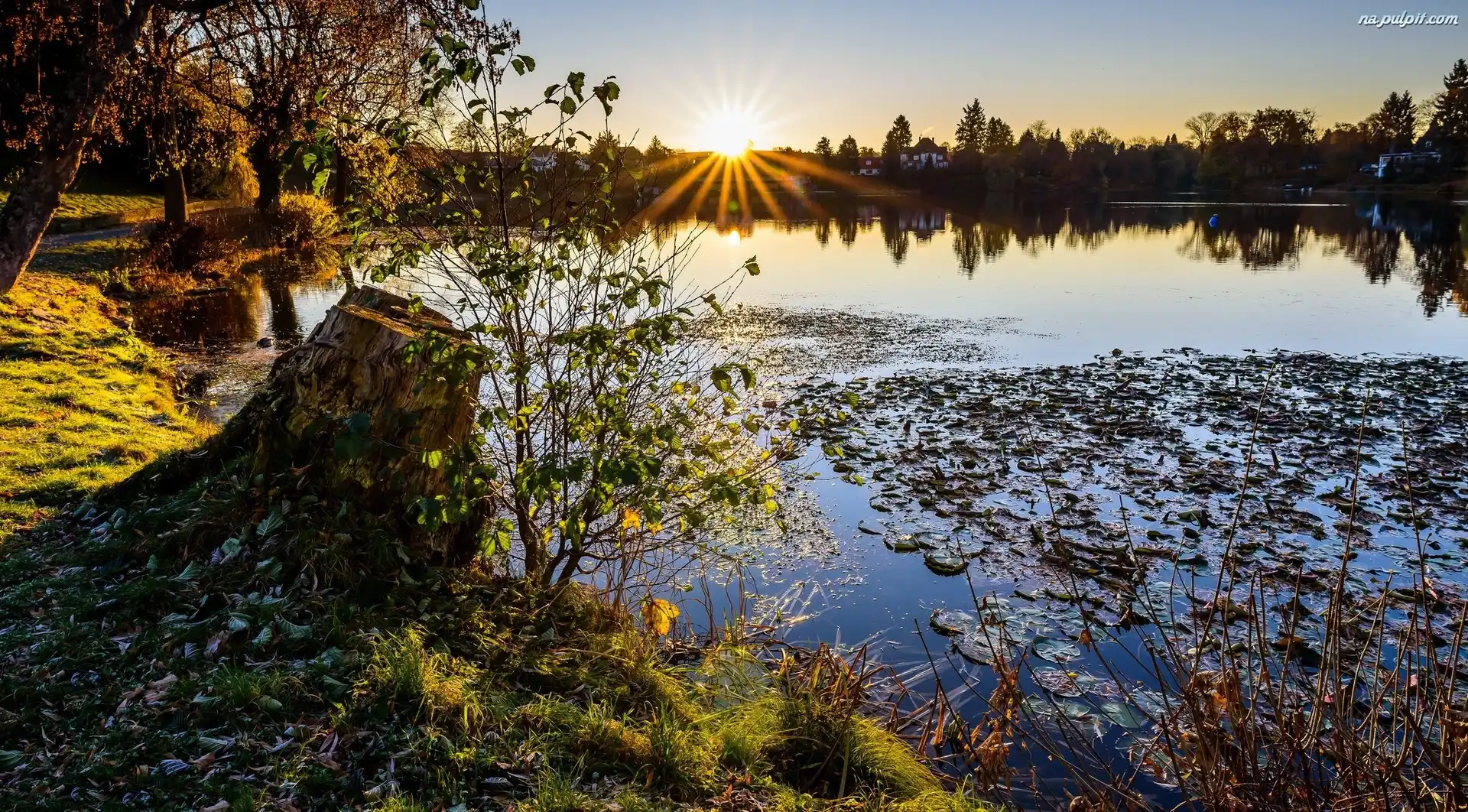 Promienie słońca, Lilie wodne, Staw, Drzewa Na Pulpit
