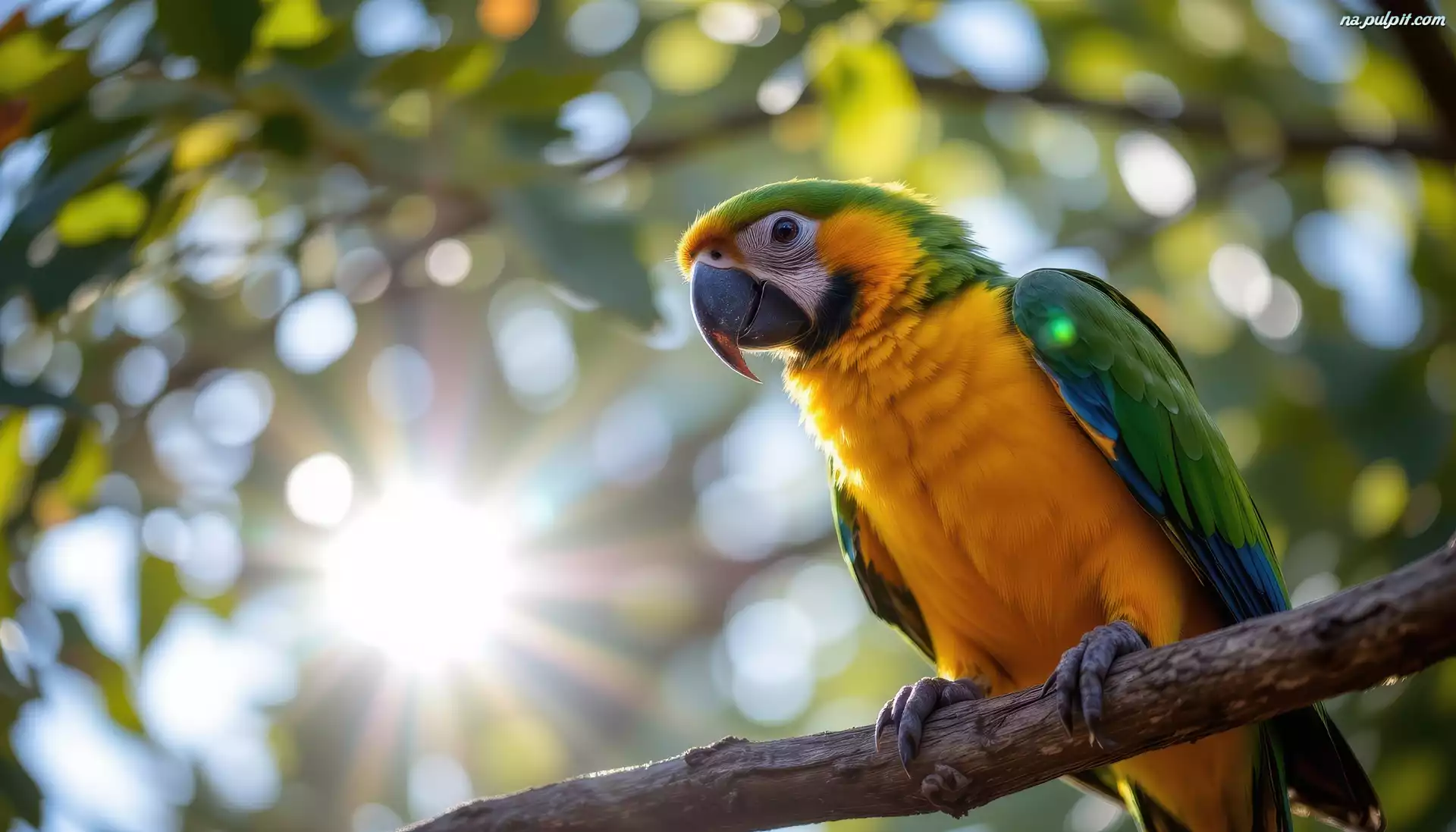 Promienie słońca, Papuga, Ara, Gałąź, Żółto-zielona, Grafika AI Na Pulpit