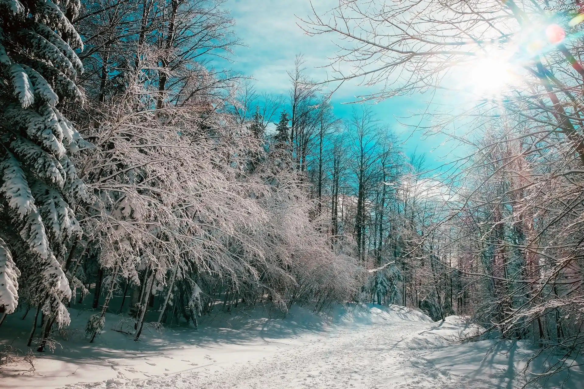 Promienie słońca, Droga, Zima, Las Na Pulpit