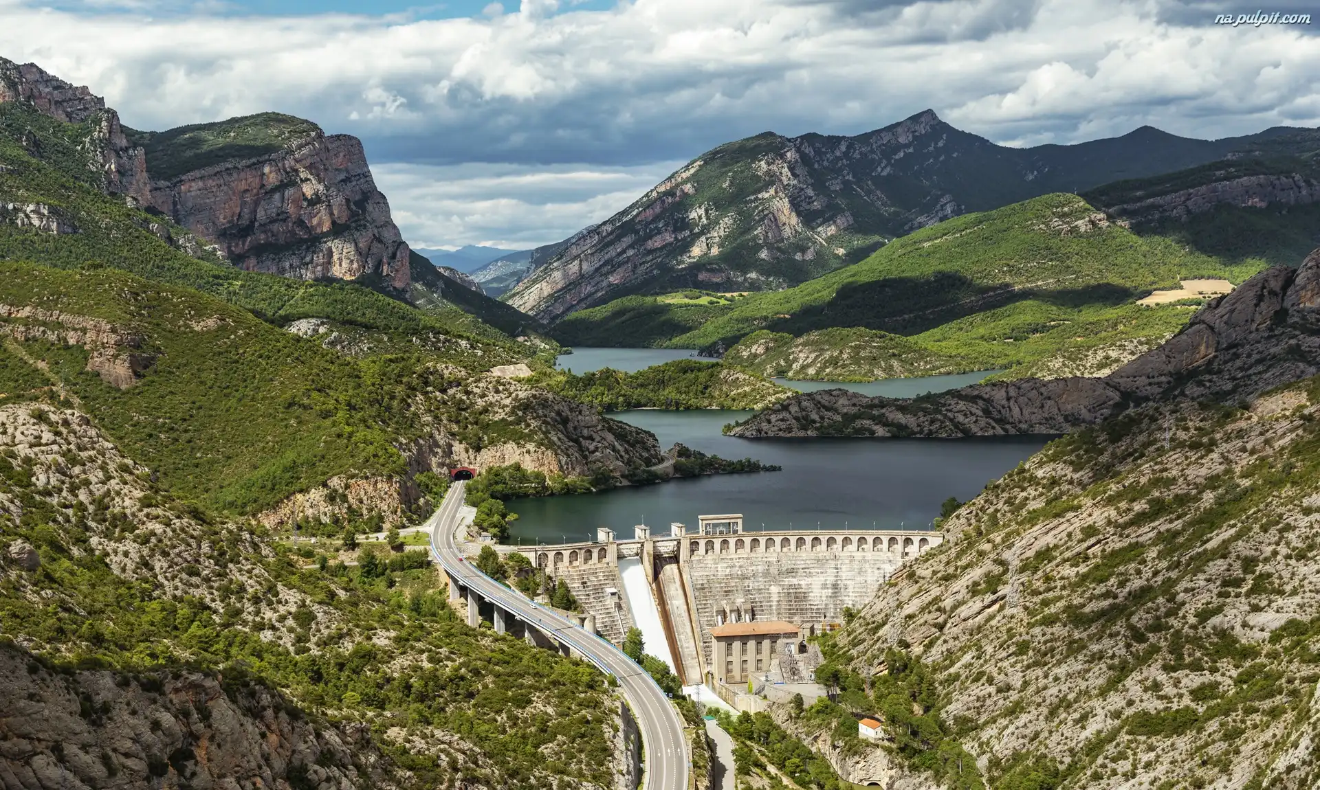 Prowincja Lleida, Most, Jeziora, Góry, Katalonia, Tama, Zapora, Chmury, Drzewa, Zapora, Zbiornik, Hiszpania, Embalse de Oliana Na Pulpit |