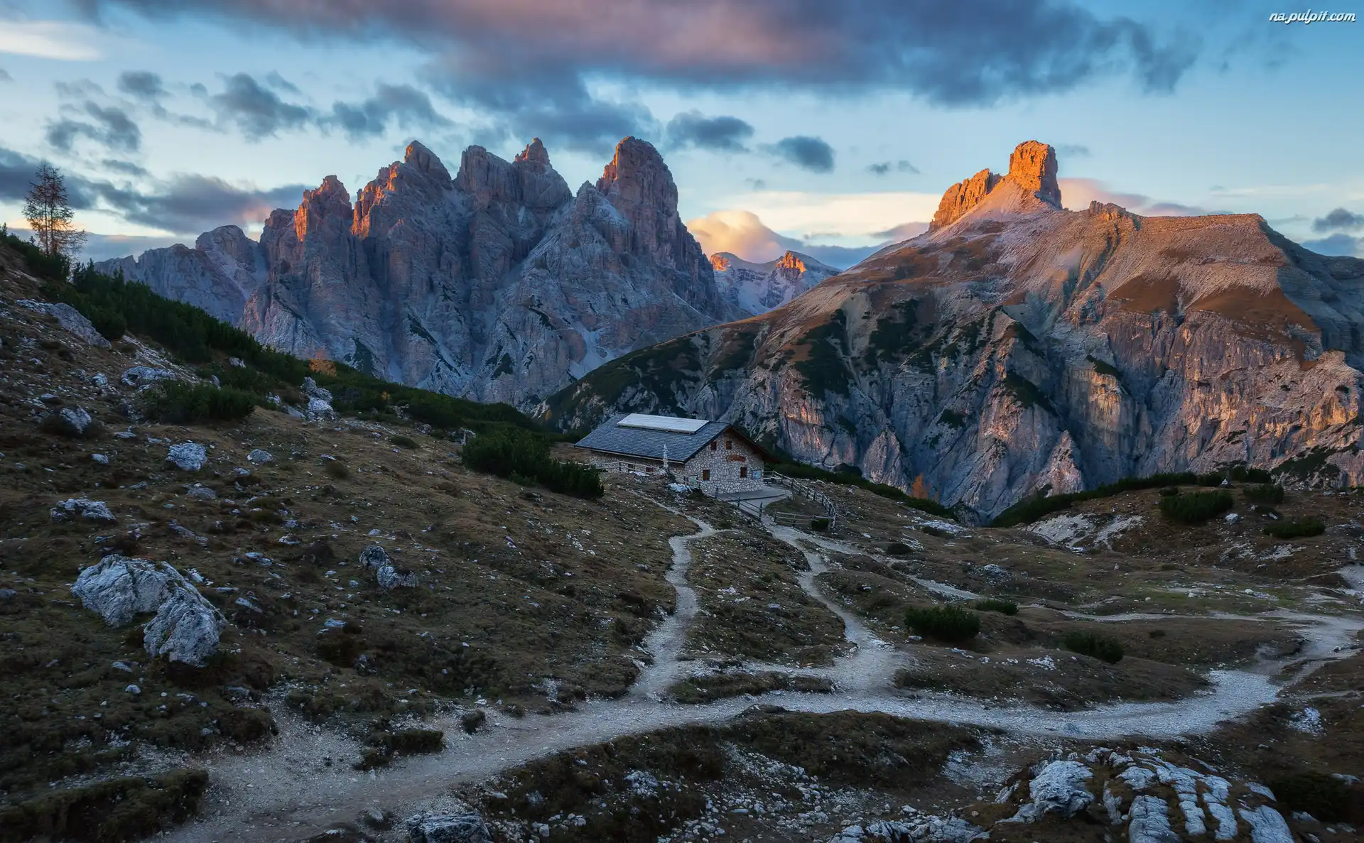 Włochy, Tre Cime di Lavaredo, Prowincja Belluno, Ścieżki, Szczyty, Góry Dolomity, Dom