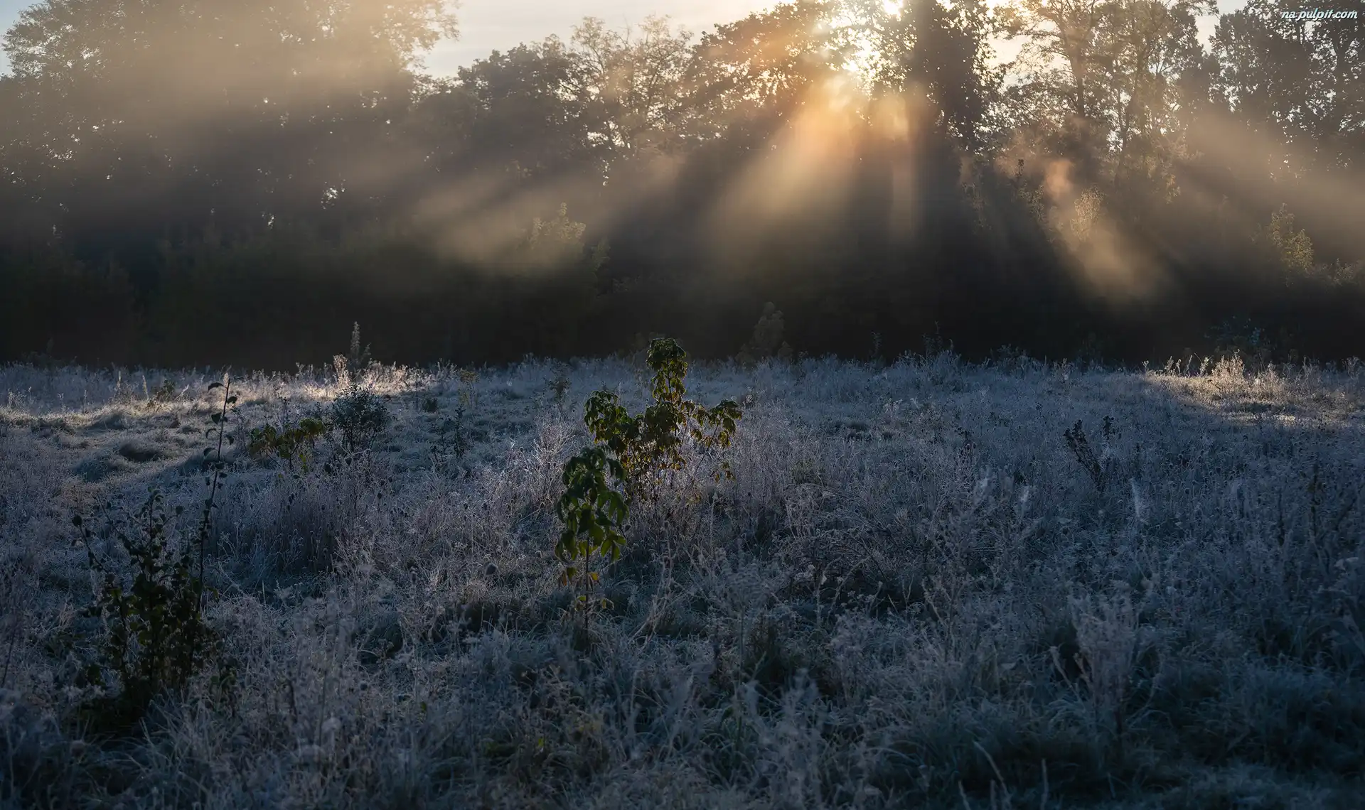 Przebijające światło, Rośliny, Drzewa, Łąka, Szron
