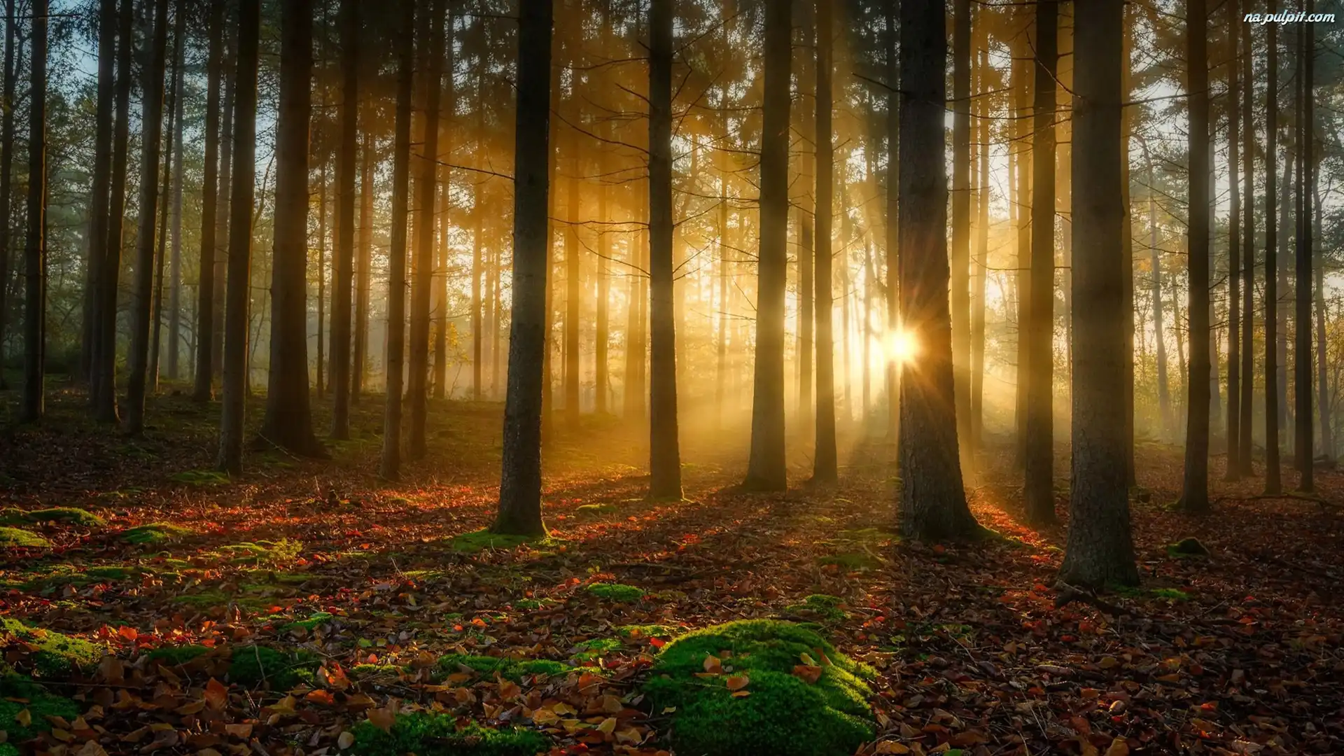 Przebijające światło, Opadłe, Las, Drzewa, Liście Na Pulpit