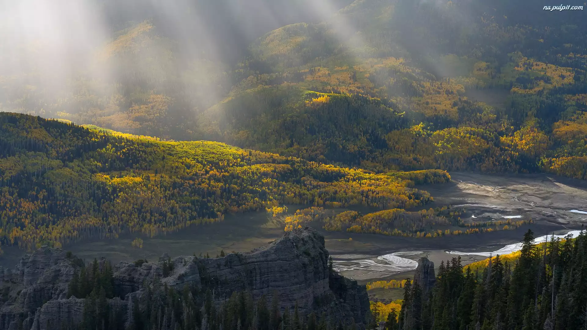 Skały, Jesień, Zalesione, Przebijające światło, Góry
