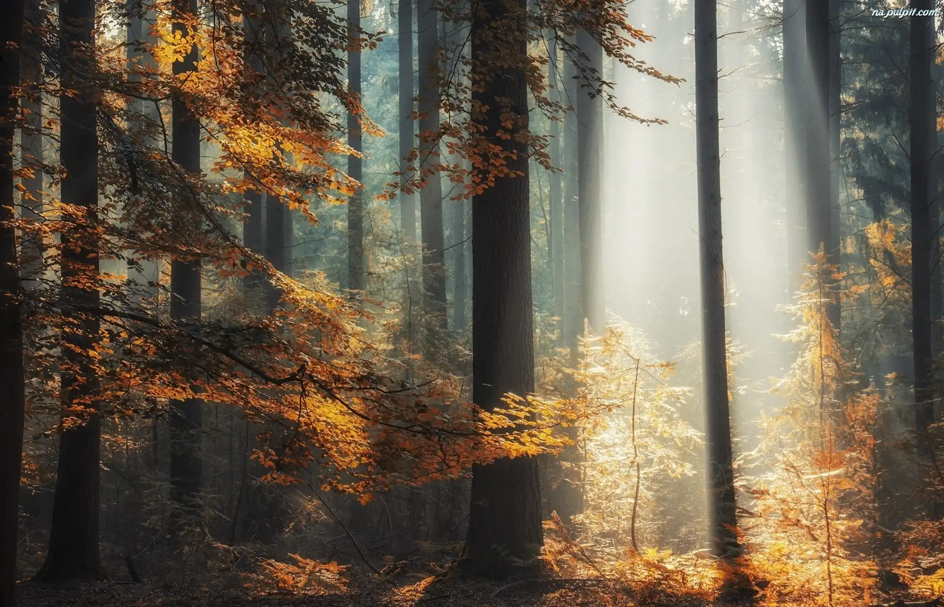Przebijające światło, Las, Jesień, Mgła Na Pulpit