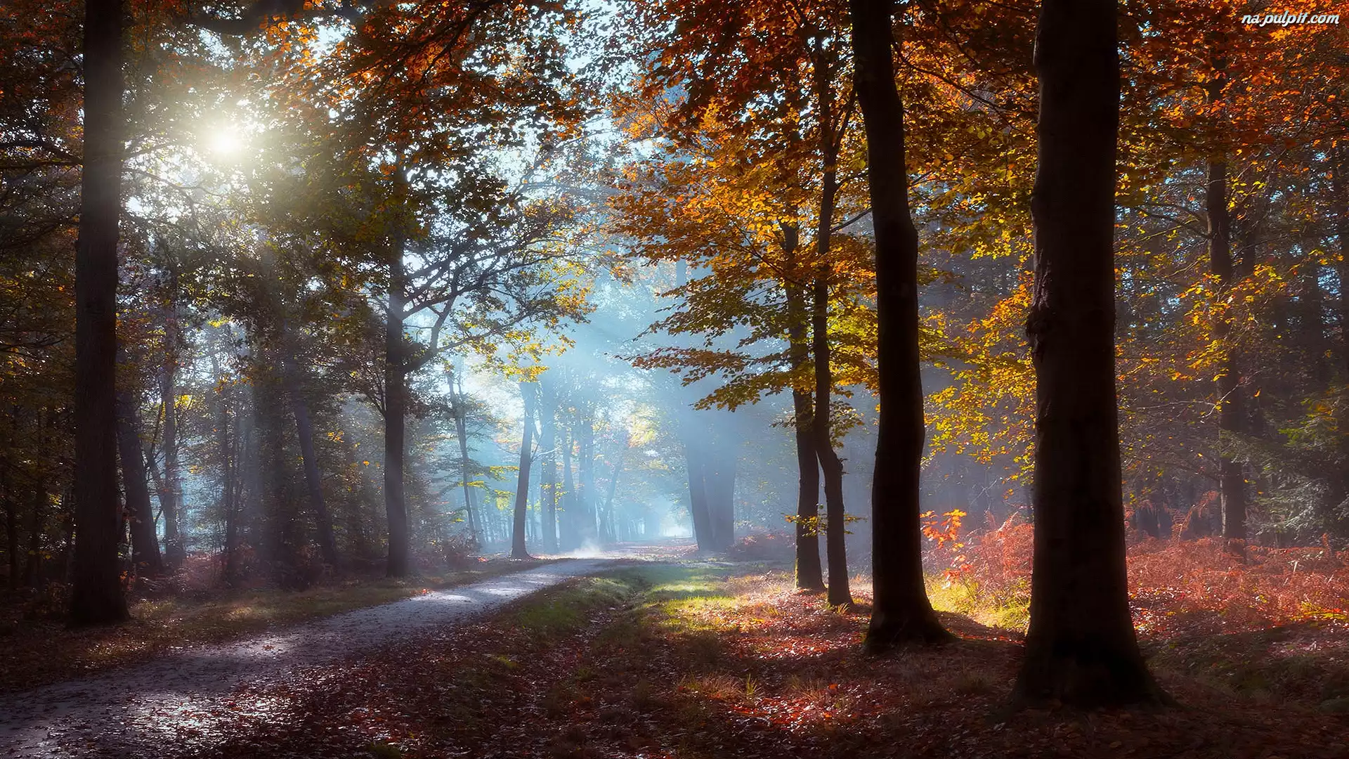 Przebijające światło, Droga, Liście, Las, Jesień, Poranek, Drzewa, Mgła Na Pulpit