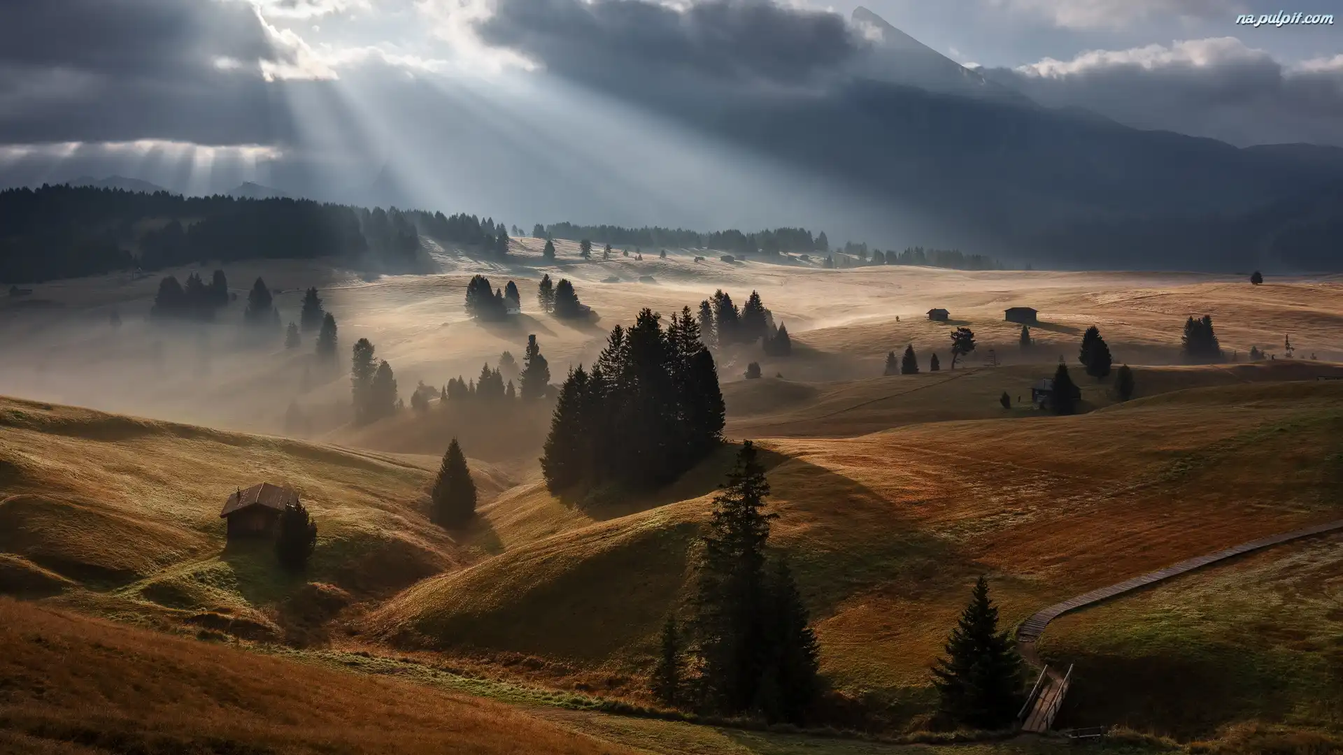 Przebijające światło, Dolomity, Dolina Val Gardena, Chmury, Domy, Drzewa, Włochy, Góry, Wschód słońca, Płaskowyż Seiser Alm Na Pulpit |
