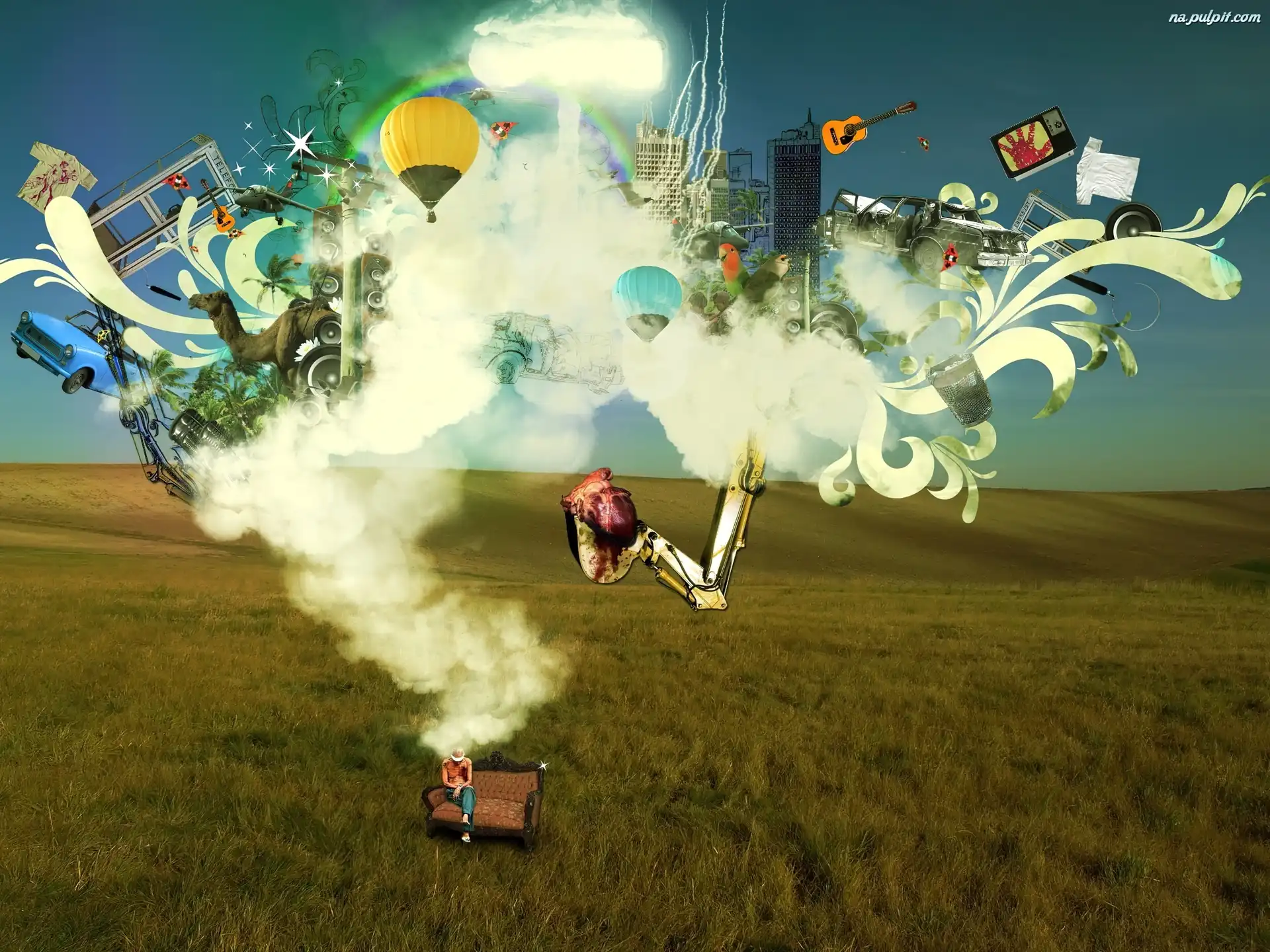 Przedmioty, Człowiek, Kanapa, Łąka, Dym