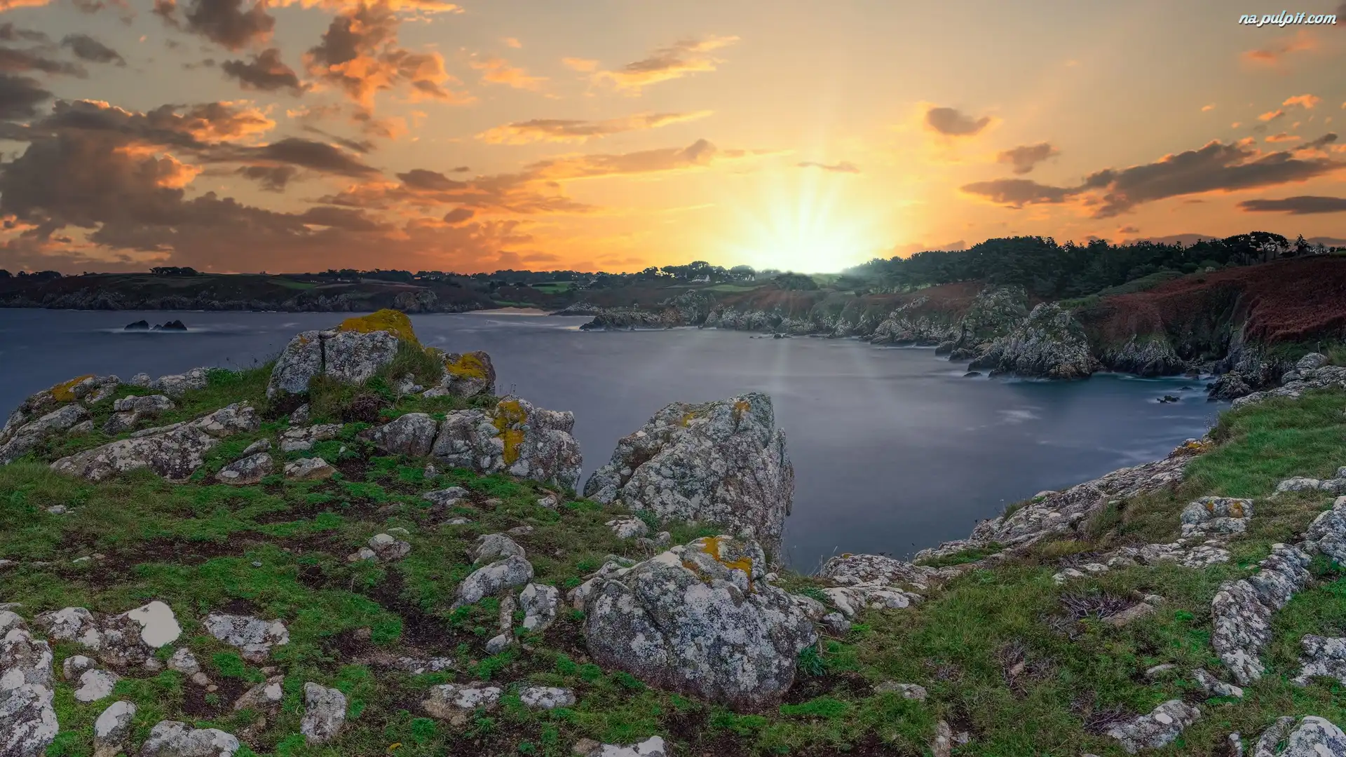 Wybrzeże, Bretania, Przylądek, Skały, Wschód słońca, Pointe de Trenaouret, Francja, Morze Na Pulpit