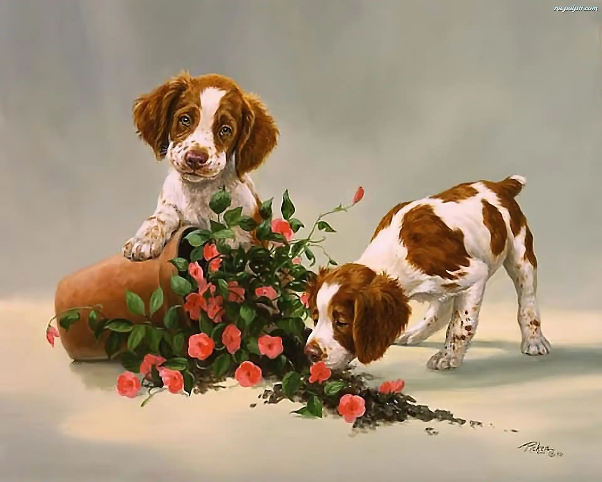 Psy, Doniczka, Kwiaty, Szczeniaki, Dwa, Przewrócona
