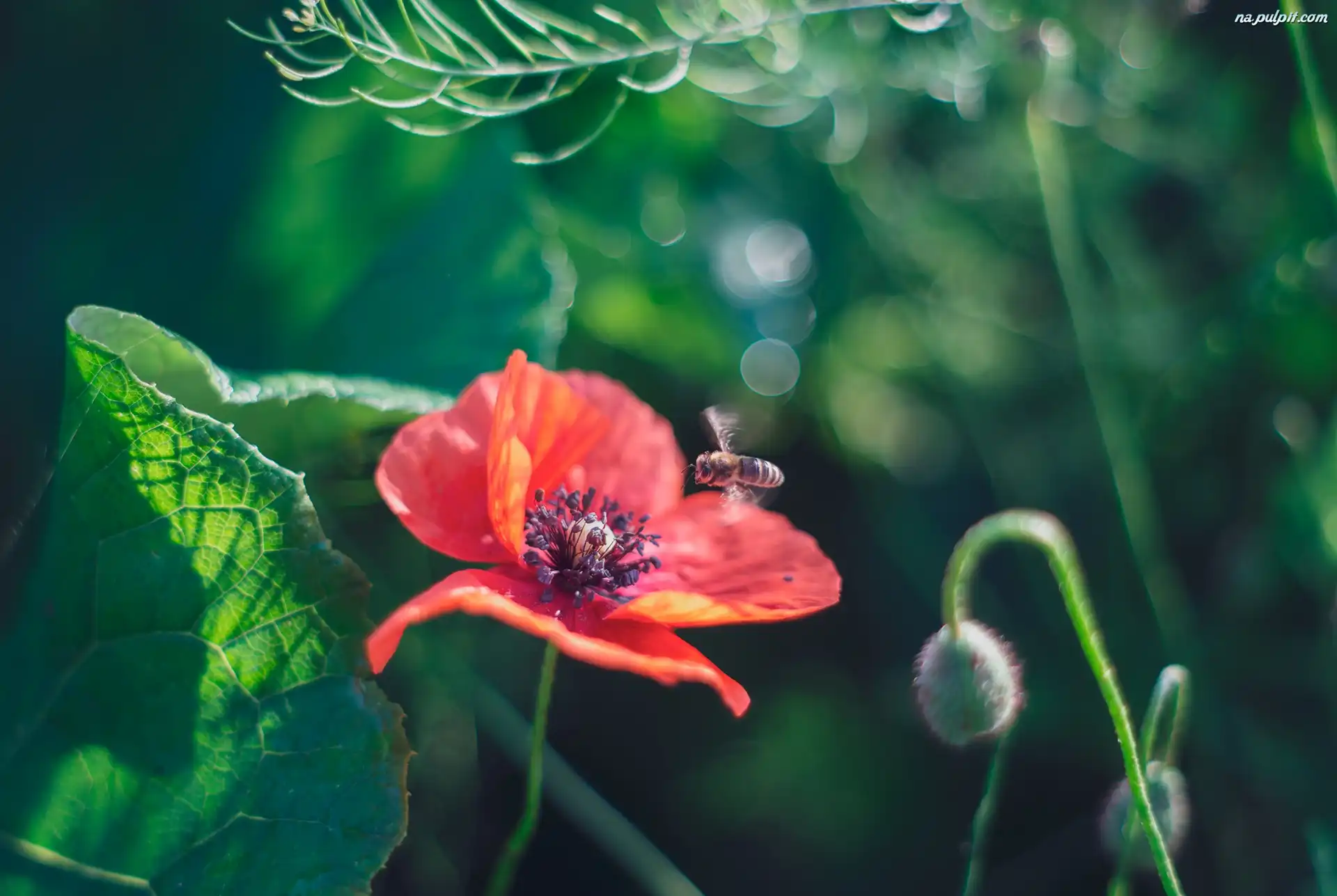 Pszczoła, Liście, Mak, Kwiat, Owad