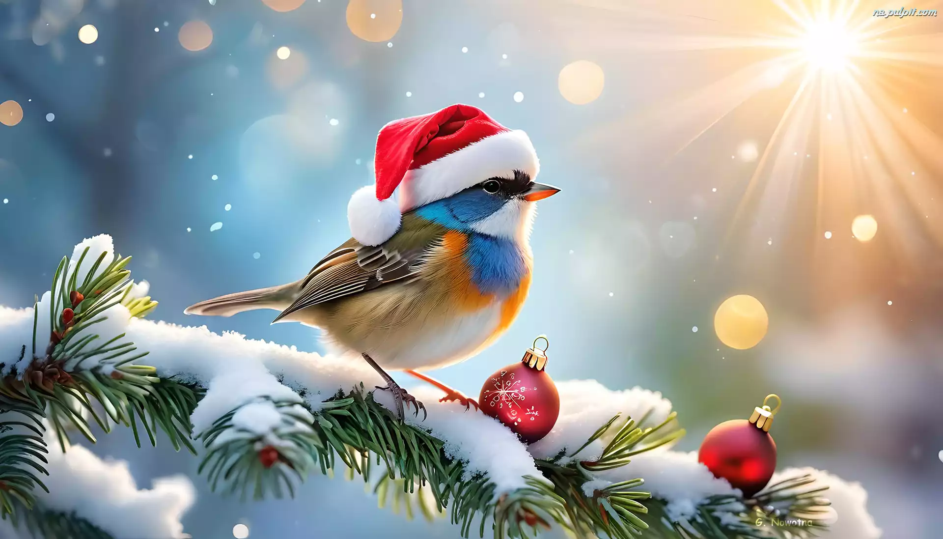 Grafika, Bombki, Gałązka, Ptak, Czapka, Mikołaja, Śnieg Na Pulpit