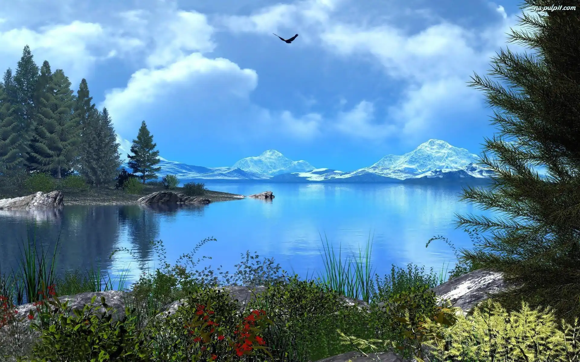 Ptak, Jezioro, Góry, Drzewa Na Pulpit