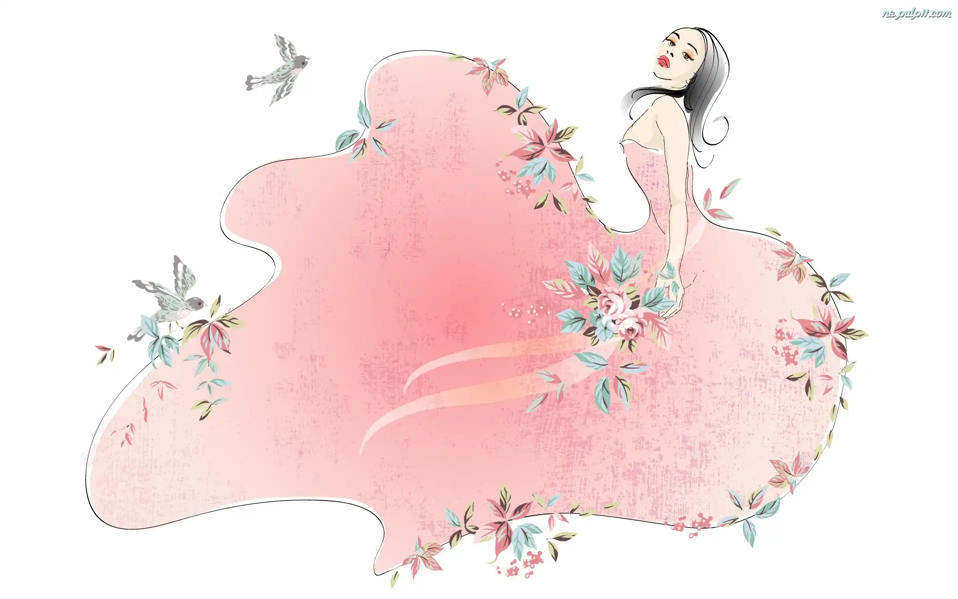 Ptak, Suknia, Różowa, Kobieta, Kwiaty Na Pulpit