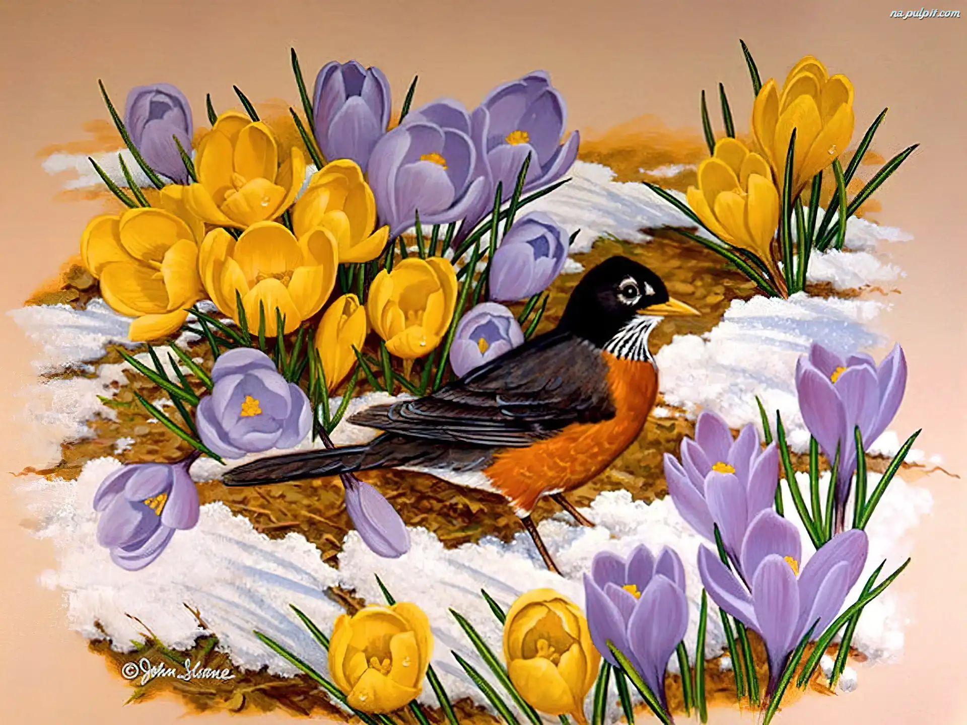 Ptak, Krokusy, Liliowe, Żółte, Śnieg Na Pulpit