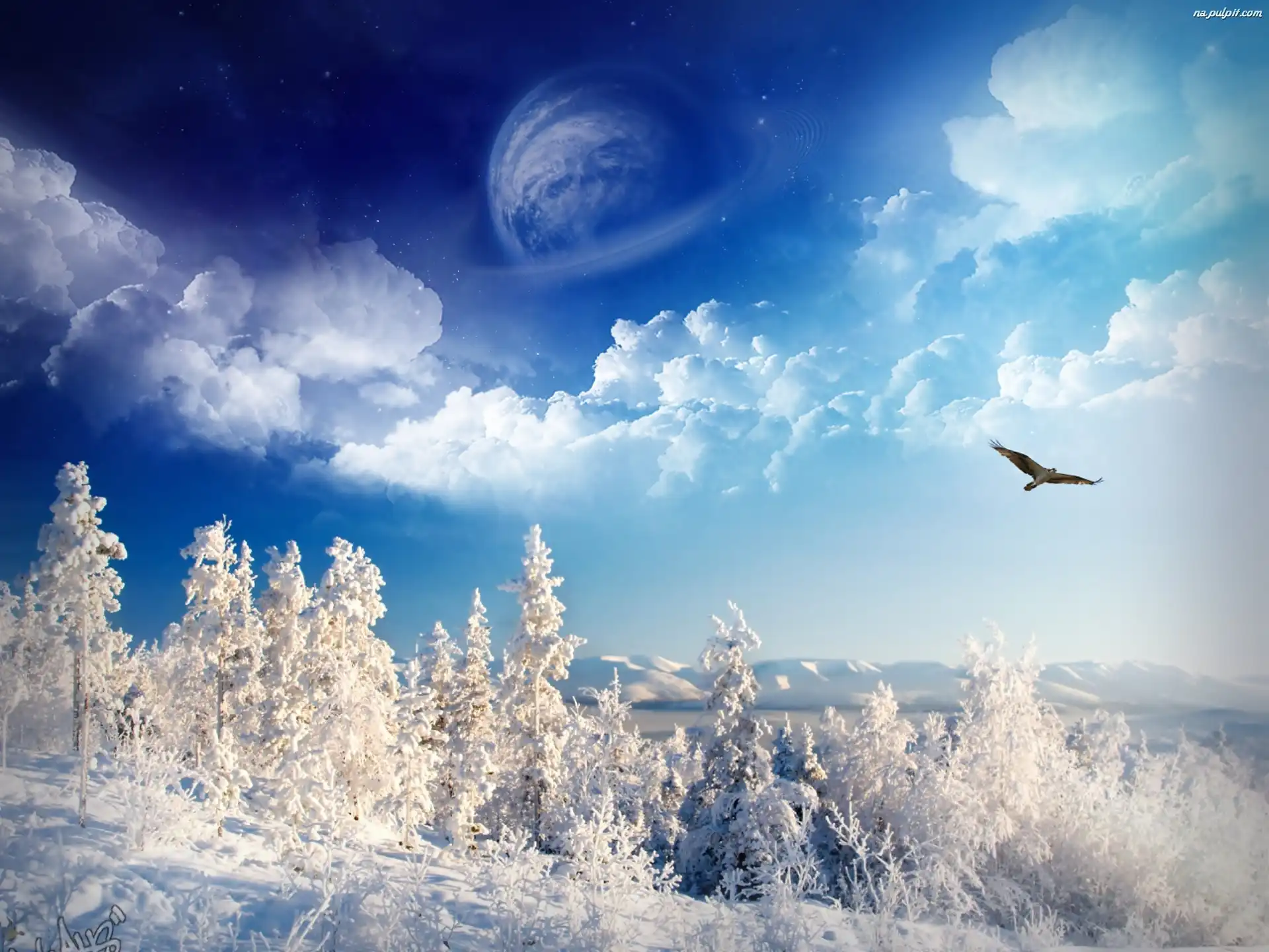 Ptak, Góry, Drzewa, Ośnieżone, Chmury