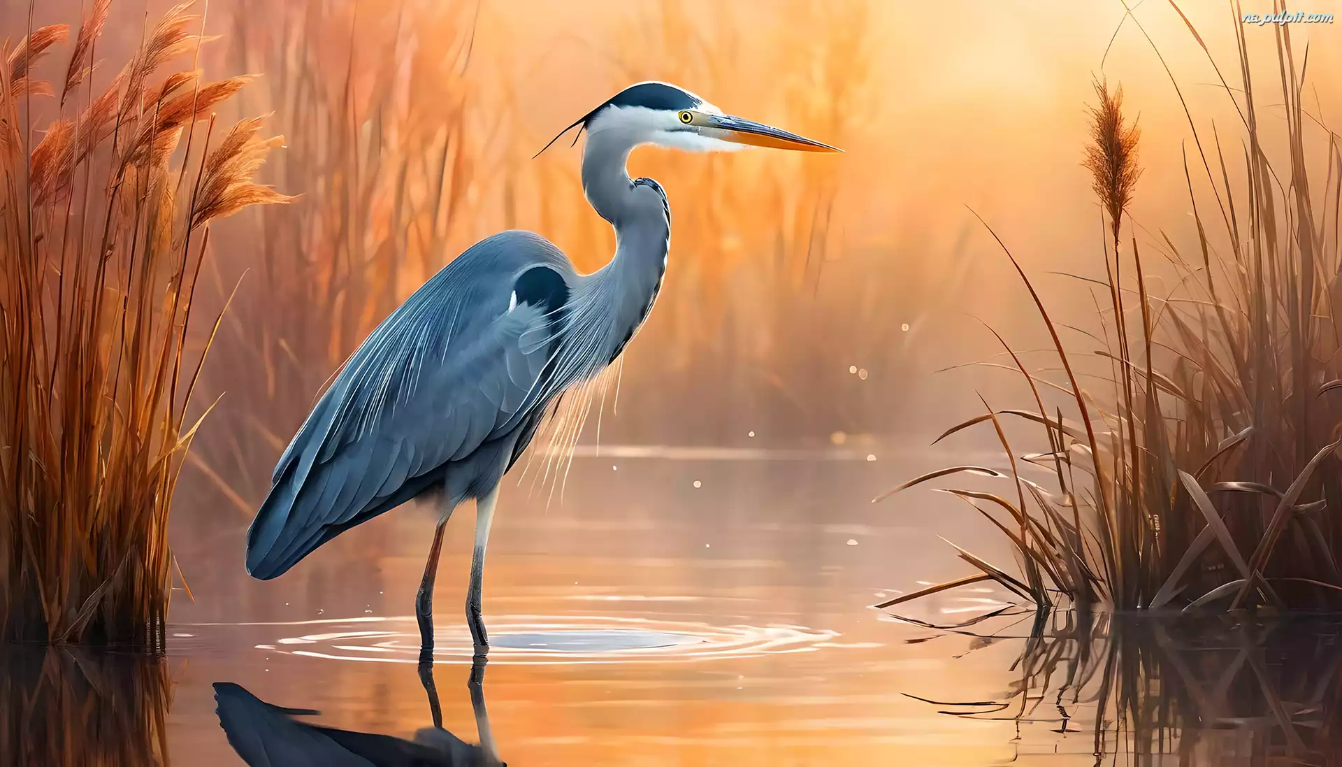 Woda, Czapla siwa, Ptak, Grafika, Szuwary Na Pulpit