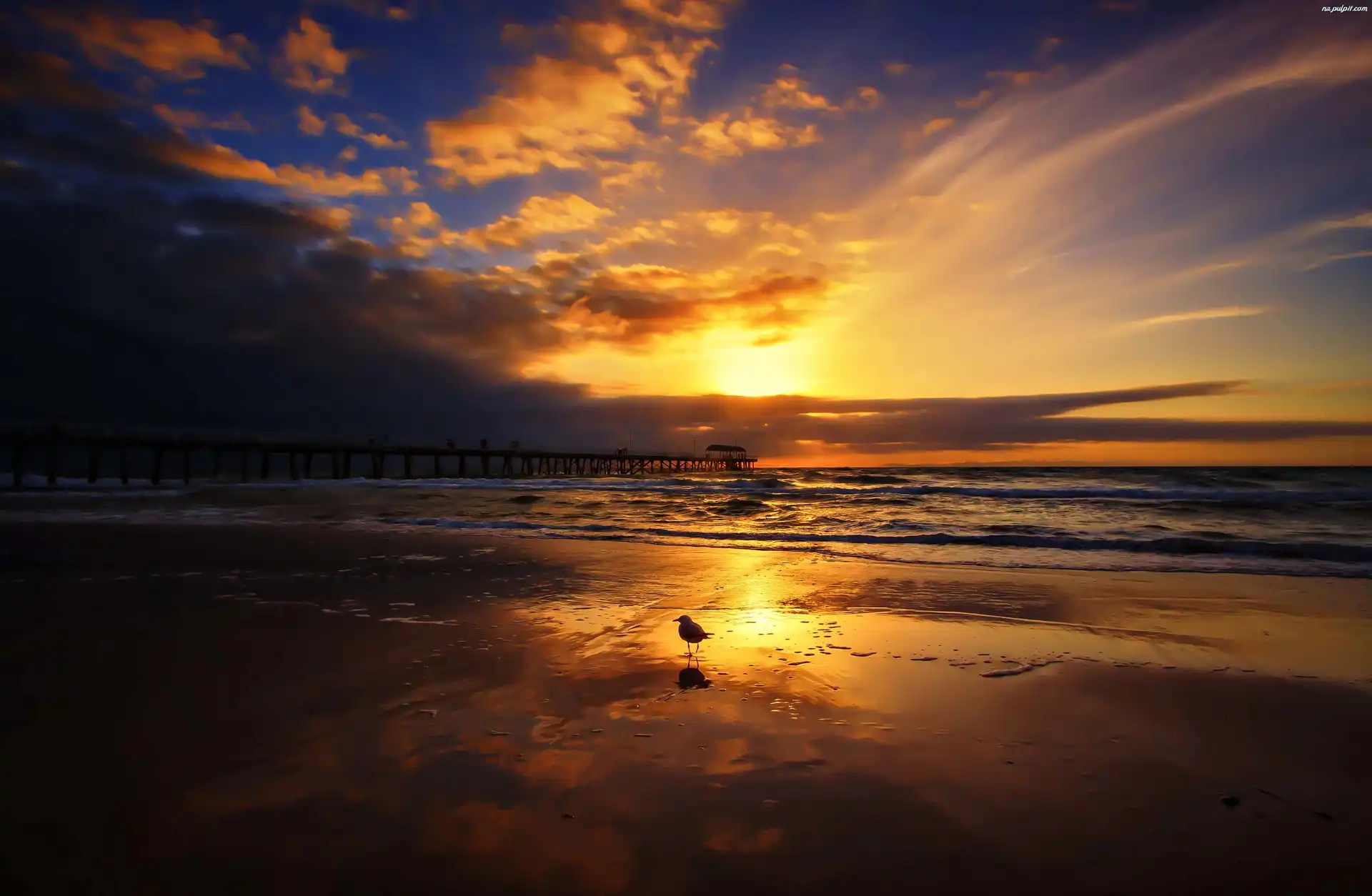 Ptak, Chmury, Morze, Zachód słońca