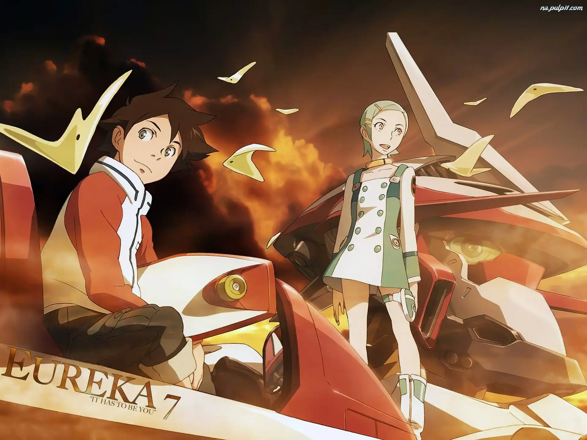 ptaki, chłopak, dziewczyna, Eureka 7, pojazd Na Pulpit