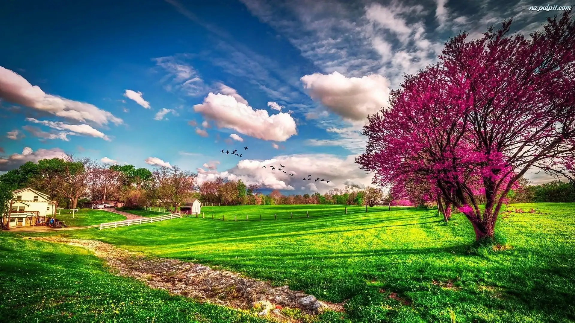 Ptaki, Drzewo, Łąki, Chmury Na Pulpit