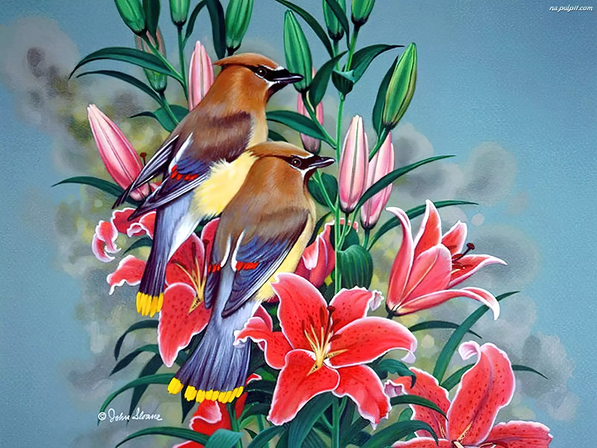 Ptaki, Lilie, Czerwone, Kolorowe Na Pulpit