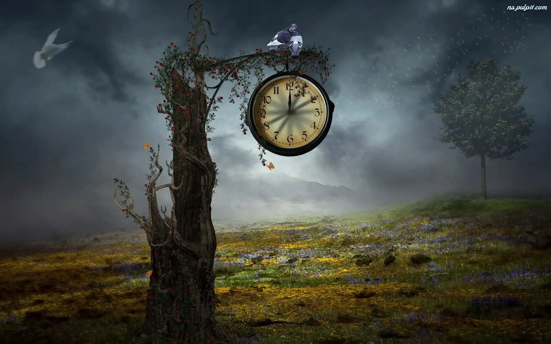 Ptaki, Zegar, Fantasy, Gołębie