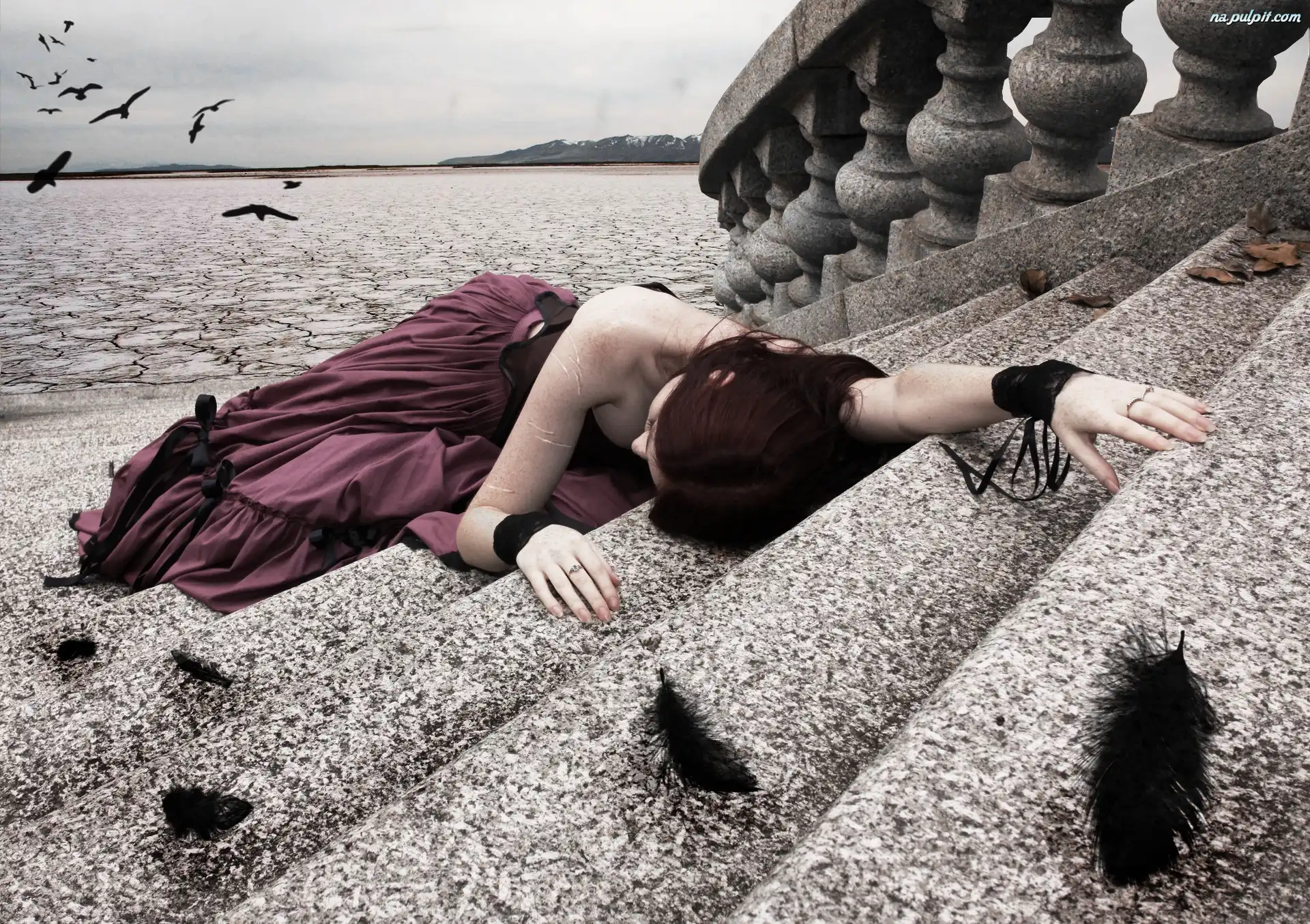 Ptaki, Schody, Kobieta, Pióra