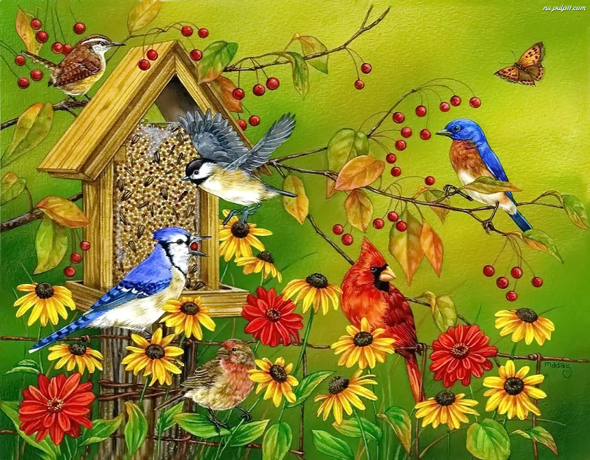 Ptaki, Czerwone, Kwiaty, Karmik, Kolorowe, Żółte Na Pulpit