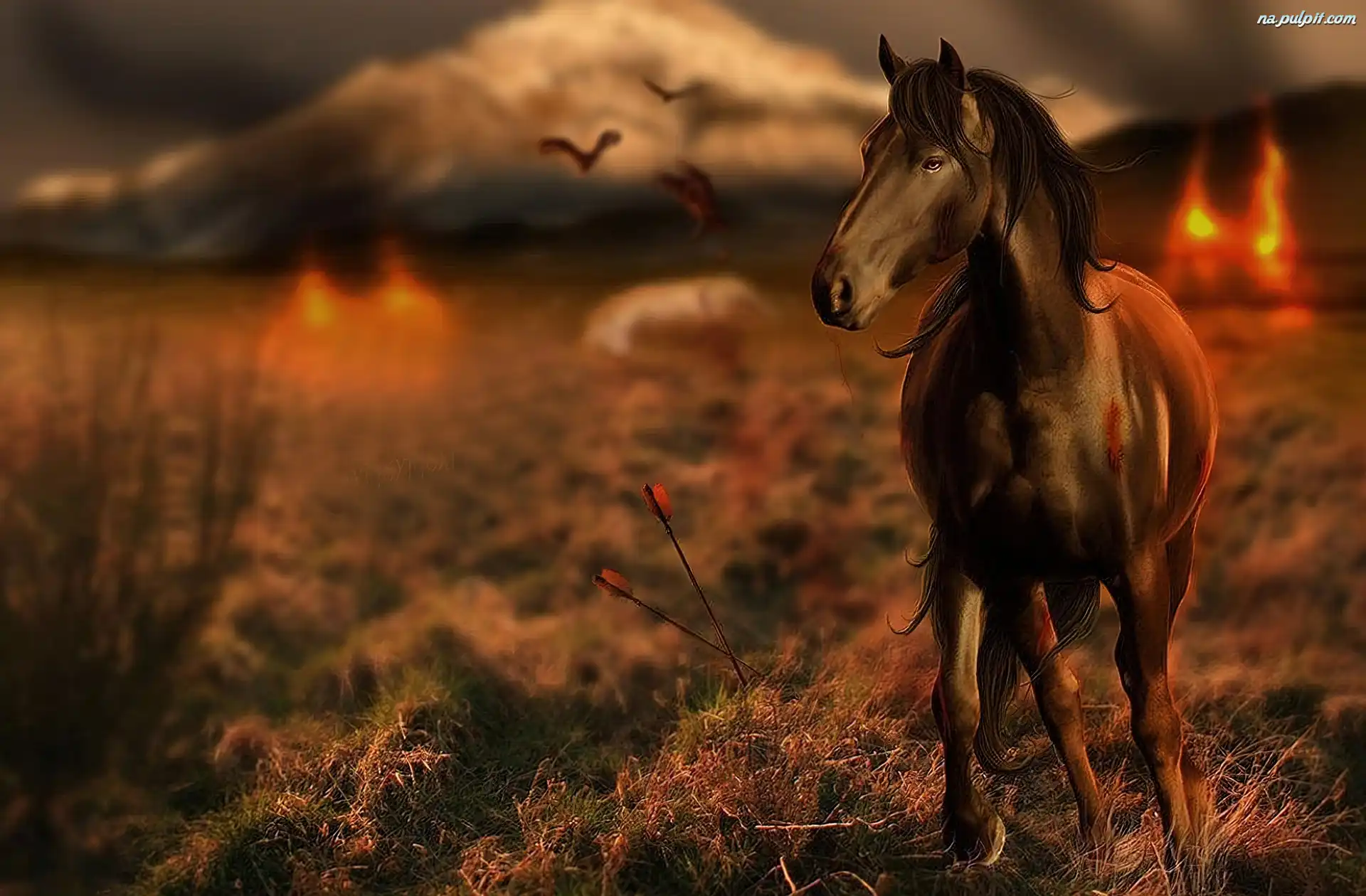 Ptaki, Zachód, Łąka, Koń, Słońca Na Pulpit