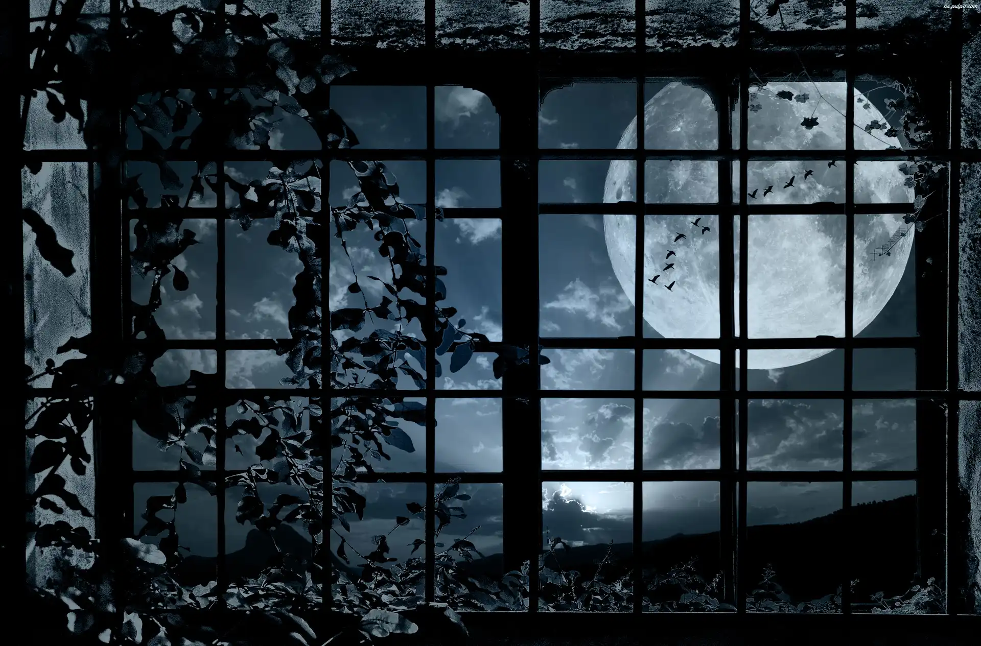Ptaki, Księżyc, Kraty, Okno, Noc
