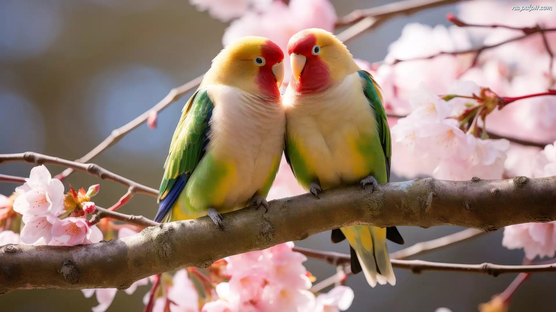 Papużki nierozłączki, Gałąź, Ptaki, Kwiaty, Papugi Na Pulpit