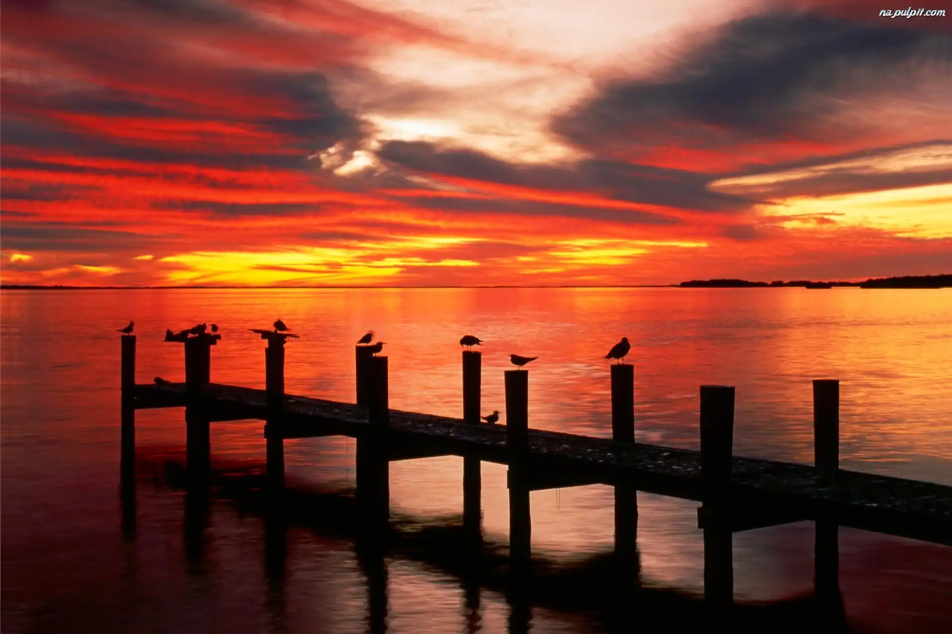 Ptaki, Słońca, Zachód, Jezioro Na Pulpit