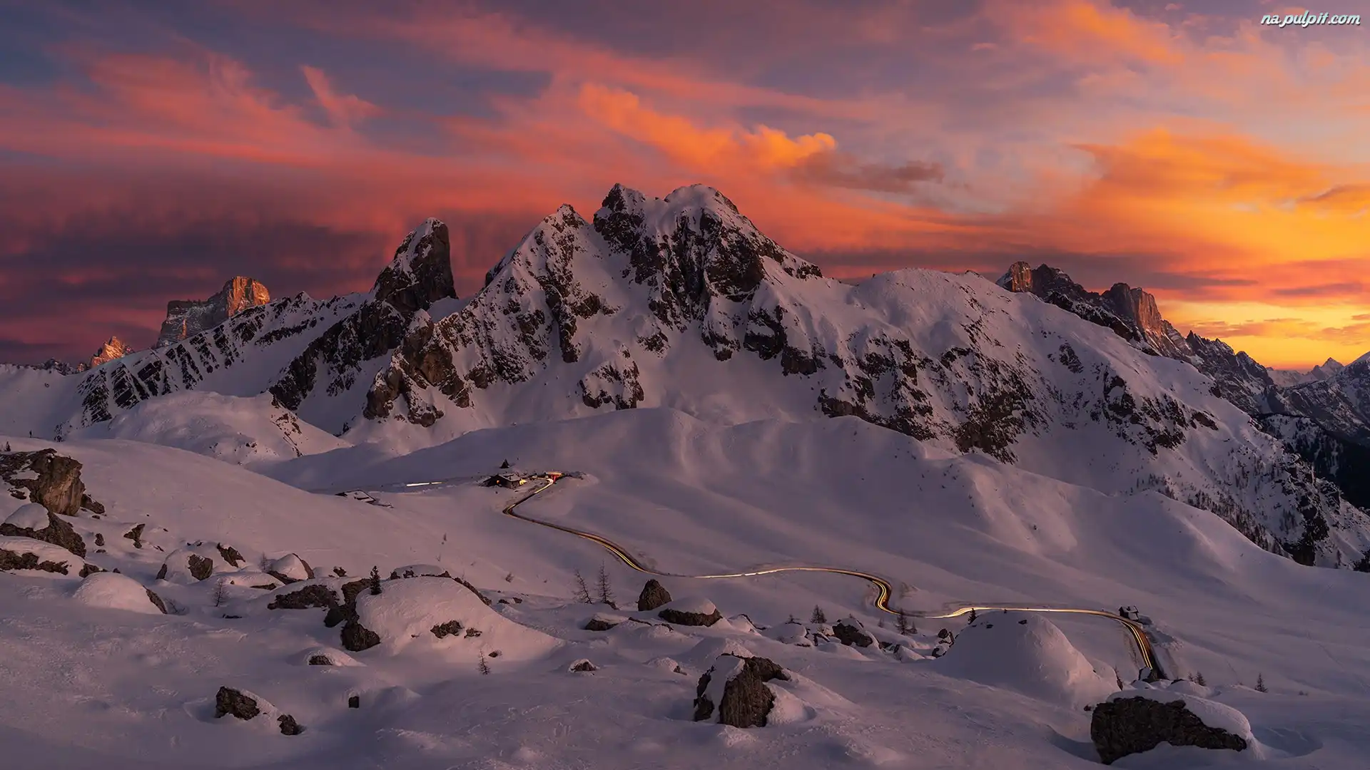 Droga, Giau Pass, Góry, Góra Ra Gusela, Belluno, Włochy, Dolomity, Zima, Kręta