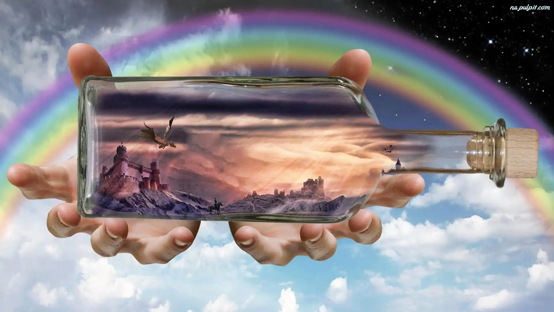 Fantasy, Ręce, Niebo, Tęcza, Butelka, Rafandynka, Chmury Na Pulpit