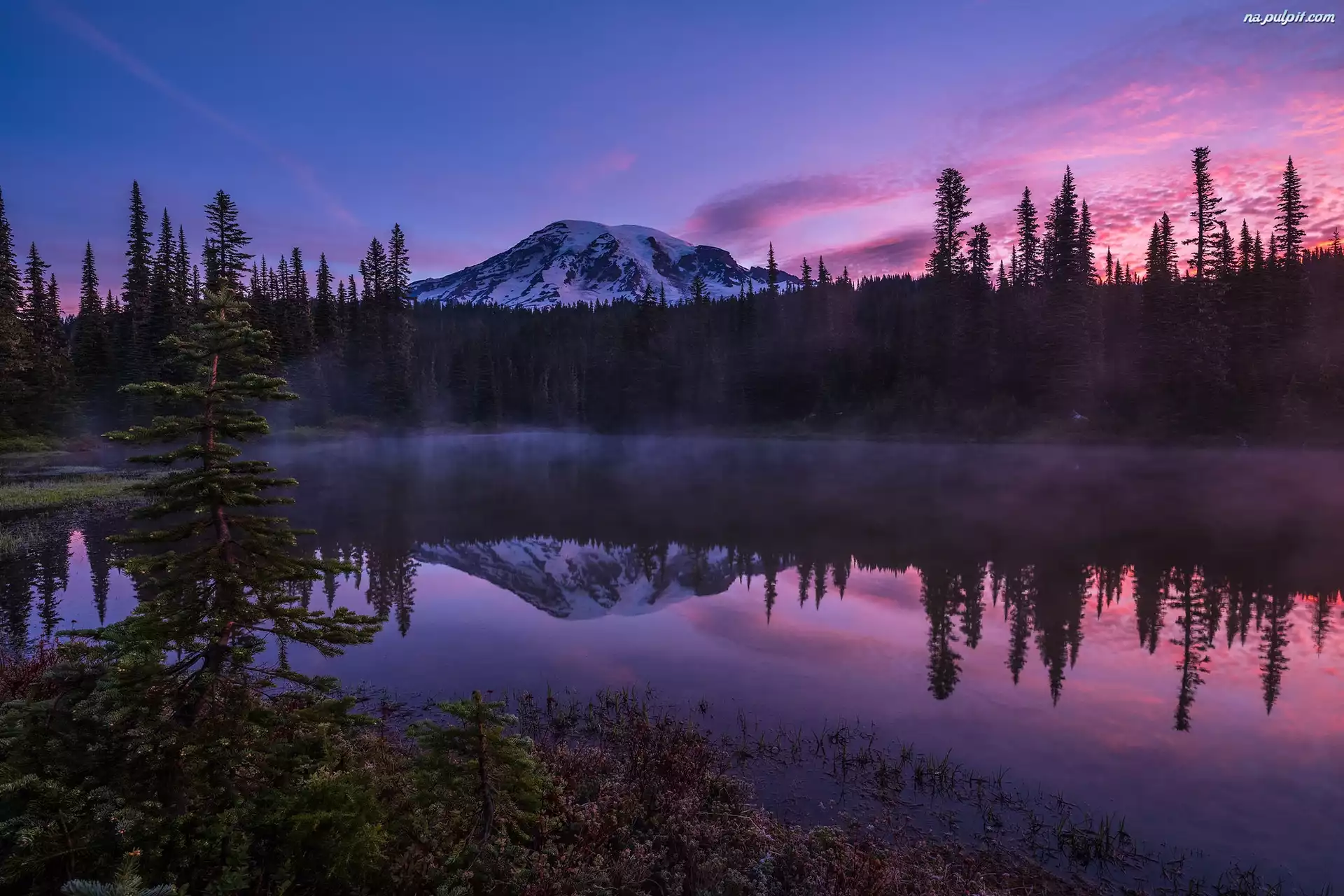 Stan Waszyngton, Góra, Stany Zjednoczone, Jezioro Reflection Lake, Mgła, Drzewa, Park Narodowy Mount Rainier, Szczyt Mount Rainier, Wschód słońca, Las Na Pulpit |