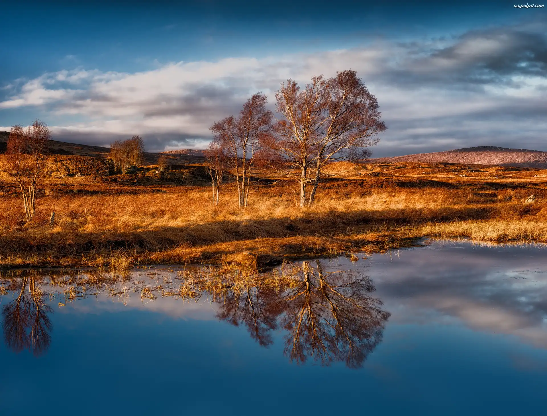 Region Highlands, JesieÅ„, Drzewa, Góry Rannoch Moor, Szkocja, Jezioro Loch Bà Na Pulpit