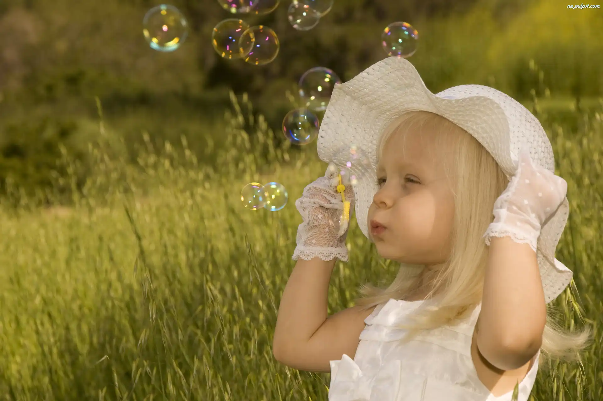 Rękawiczki, Łąka, Dziewczynka, Bańki, Kapelusz Na Pulpit