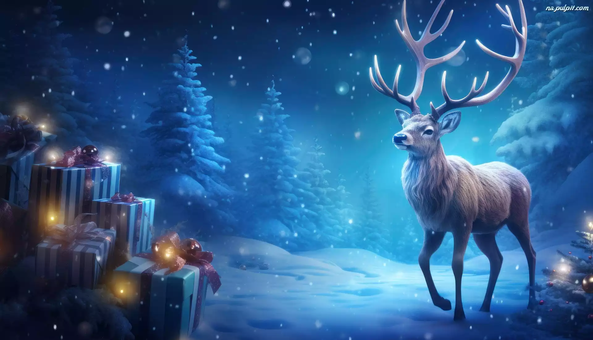 Grafika, Zima, Drzewa, Boże Narodzenie, Prezenty, Ośnieżone, Renifer Na Pulpit