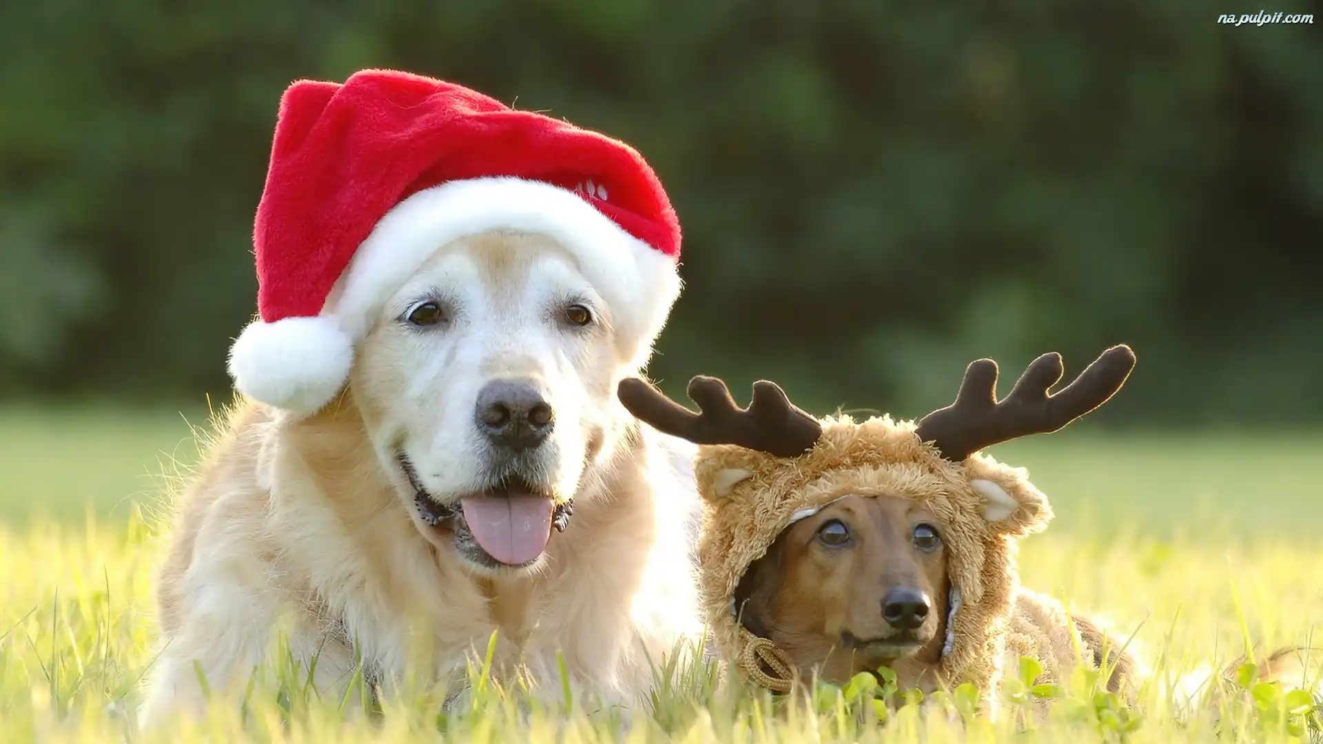 Renifer, Czapki, Psy, Dwa, Mikołaj