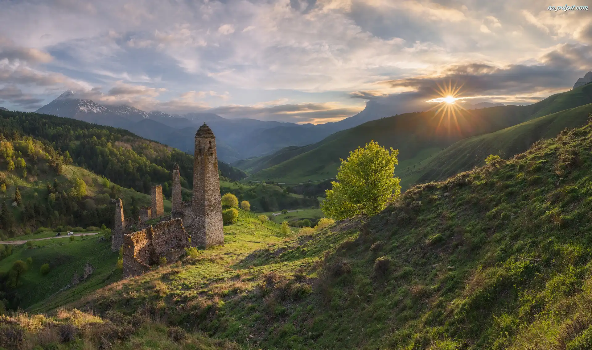 Erzi, Kaukaz, Ruiny, Wieże obronne, Republika Inguszetii, Rosja, Promienie słońca, Góry, Drzewa Na Pulpit |