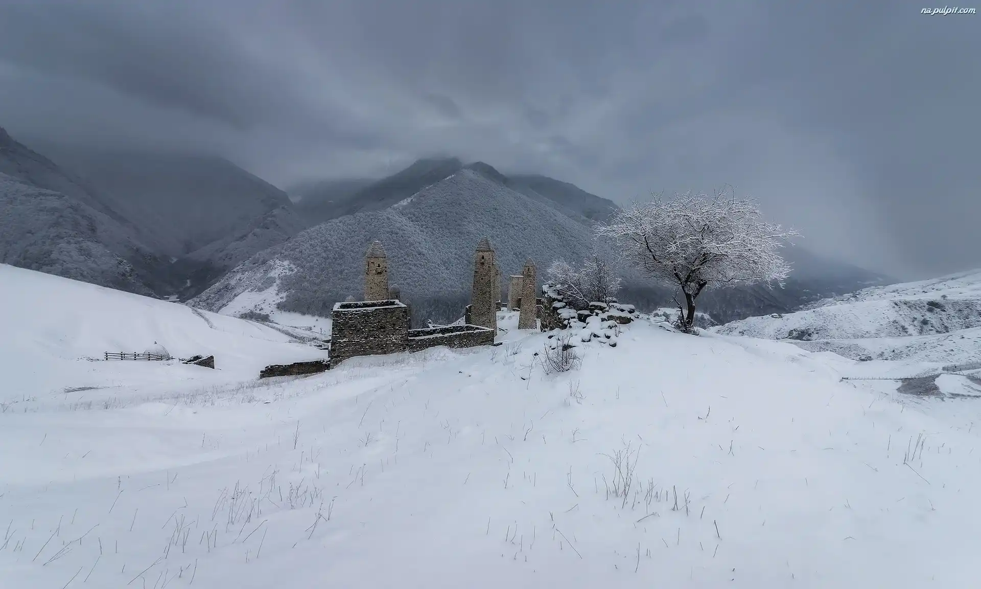 Góry, Drzewo, Ruiny, Kaukaz, Erzi, Republika Inguszetii, Rosja, Wieże obronne, Zima, Drzewa Na Pulpit |